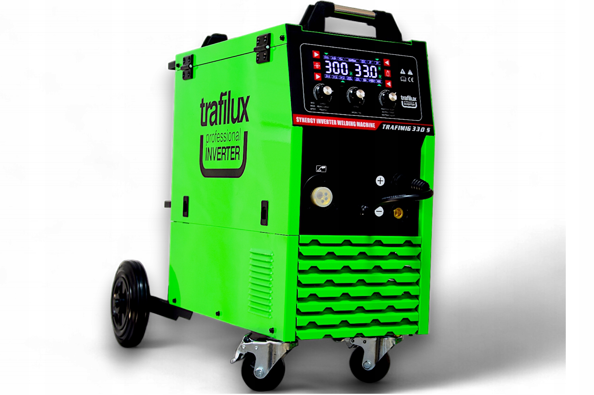 Traulux Mig 330S MMA Synergia -это профессиональная инвертовая синергетическая сварка полуавтоматическая, которая используется для сварки низкоуглеродной стали, магии с низким содержанием кост, мигплавкой и алюминиевых сплавов. Кроме того, он позволяет использовать самооцентрирующие провода - ядро для сварки без дополнительного защитного газа. Устройство обеспечивает сварку с оберщенными электродами - функция MMA и сварка в режиме подъема TIG. Trafimig 330S создается для работы в мастерской и промышленных условиях. Устройство можно использовать как внутри, так и из закрытых комнат. Твердые колеса с тормозной системой обеспечивают стабильность при использовании больших защитных газовых цилиндров. Конструктивным преимуществом устройства являются транзисторы, изготовленные в технологии IGBT. Характерной особенностью этого типа транзисторов является меньшее потребление энергии, меньше электромагнитных помех, с большей эффективностью и более сильной и стабильной сварной аркой.
