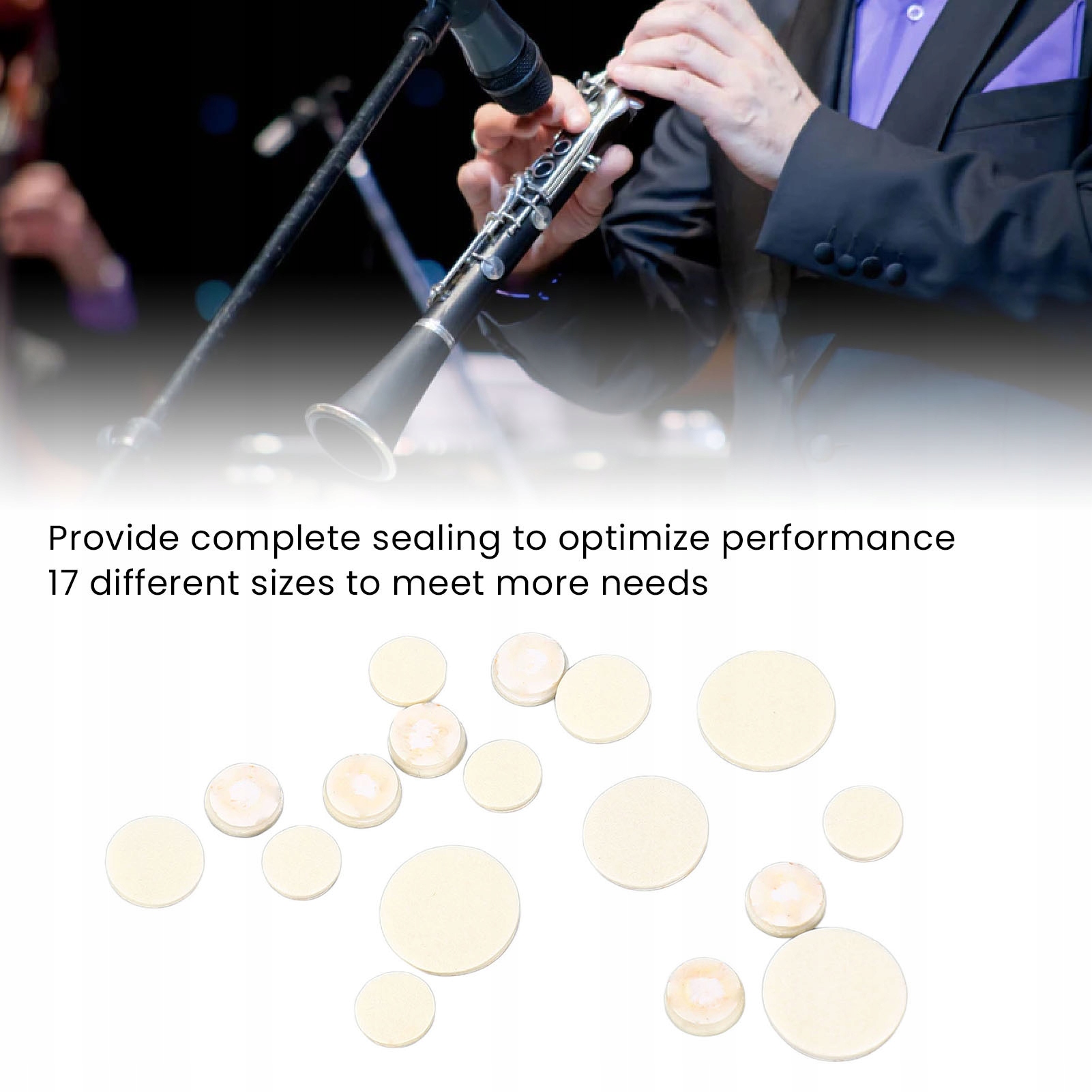 4. 17 РАЗНЫХ РАЗМЕРОВ: В этот набор входят 17 подушечек со звуковыми отверстиями различных размеров, которые могут удовлетворить потребности кларнетов разных типов и марок.