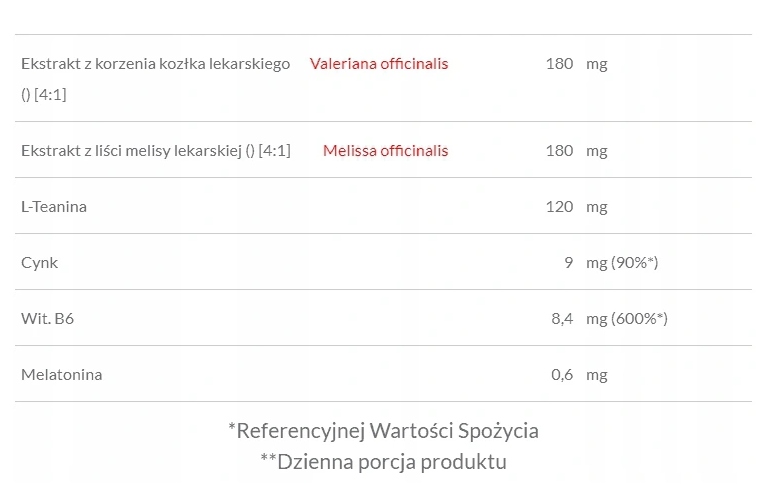 Мальтодекстрин; L-аргинина гидрохлорид; магний (цитрат магния, лактат магния); L-глютамин; D-аспарагиновая кислота (DAA); L-лизина гидрохлорид; L-орнитина альфа-кетогутарат; гамма-аминомасляная кислота (ГАМК); L-триптофан; экстракт корня валерианы (Valeriana officinalis) [4:1]; экстракт листьев мелиссы (Melissa officinalis) [4:1]; ароматизаторы; антислеживатель – диоксид кремния; регулятор кислотности – яблочная кислота; L-теанин; цинк (глюконат цинка); загустители – карбоксиметилцеллюлоза натрия, ксантановая камедь; подсластитель – сукралоза; краситель со вкусом тропического апельсина – бета-каротин; вит. B6 (пиридоксина гидрохлорид); краситель для карамели – азорубин; мелатонин.