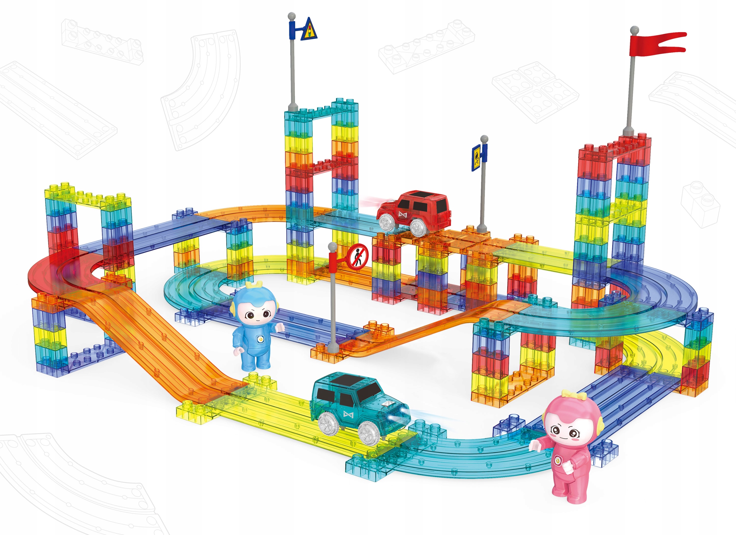 Элементы трека соединяются с помощью безопасных магнитов, встроенных в их конструкцию. Благодаря этому дети могут легко и быстро создавать уникальные спуски, повороты и подъемы. Другие элементы набора включают традиционные блоки, из которых можно строить колонны, башни и многие другие конструкции — настоящее удовольствие для маленьких любителей строить здания.