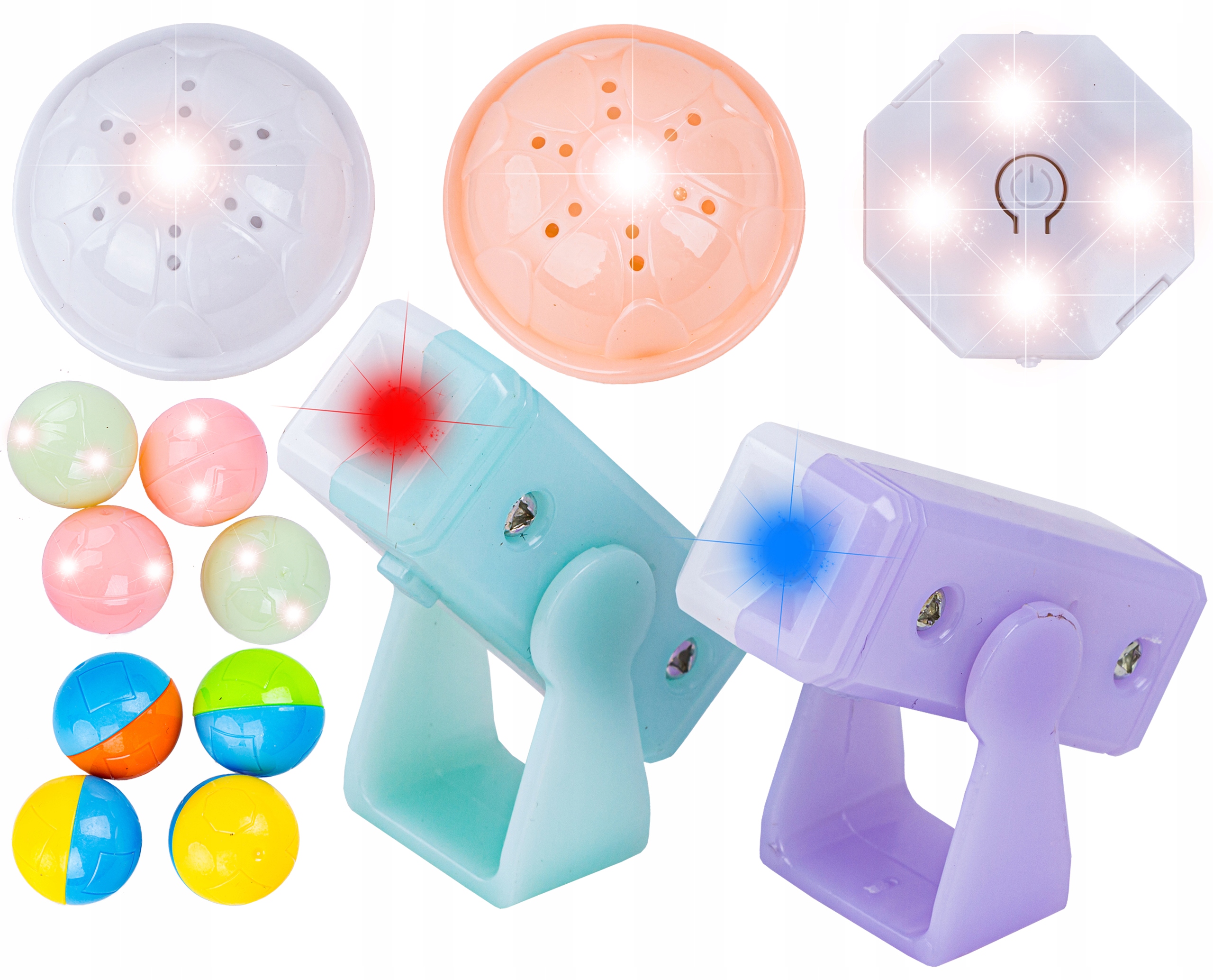 Набор включает в себя светящиеся шарики, фары и освещенные блоки :