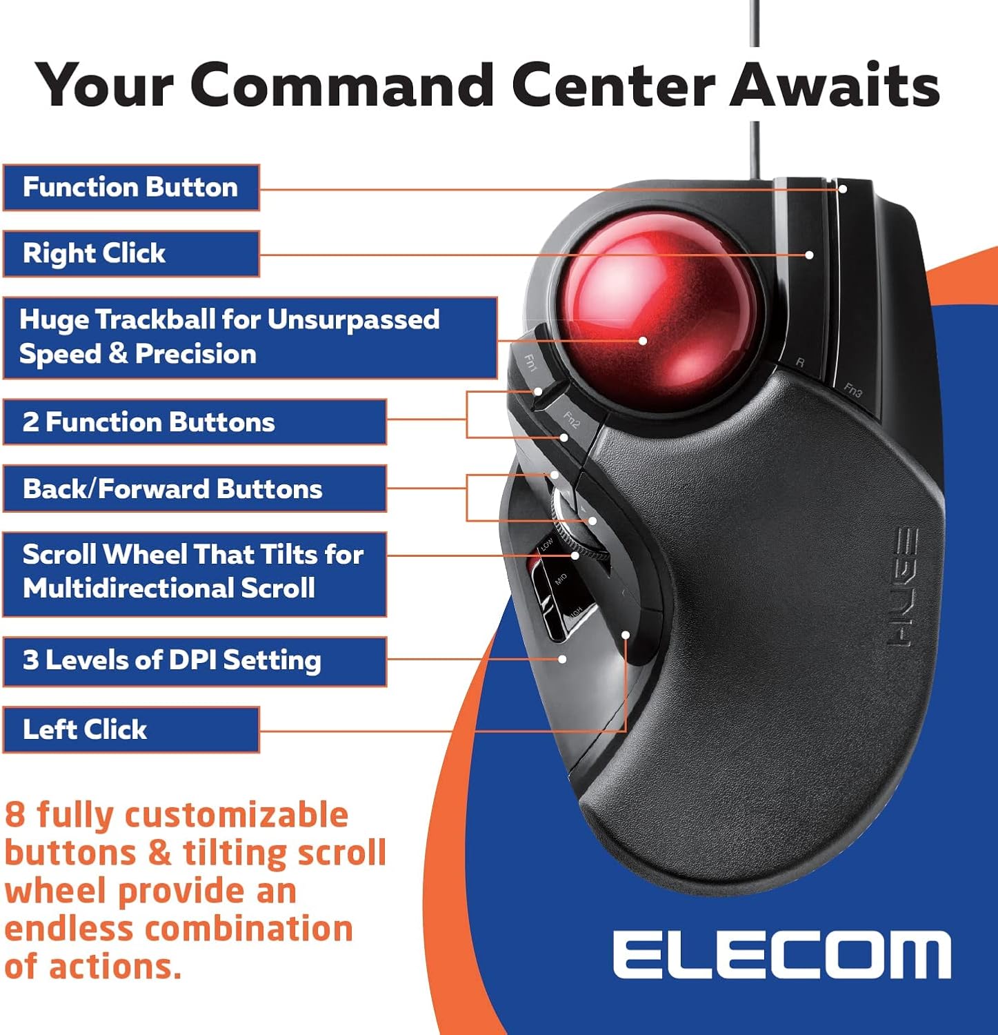 Проводная большая трекбольная мышь ELECOM с 8 кнопками, плавным отслеживанием и точным оптическим игровым сенсором