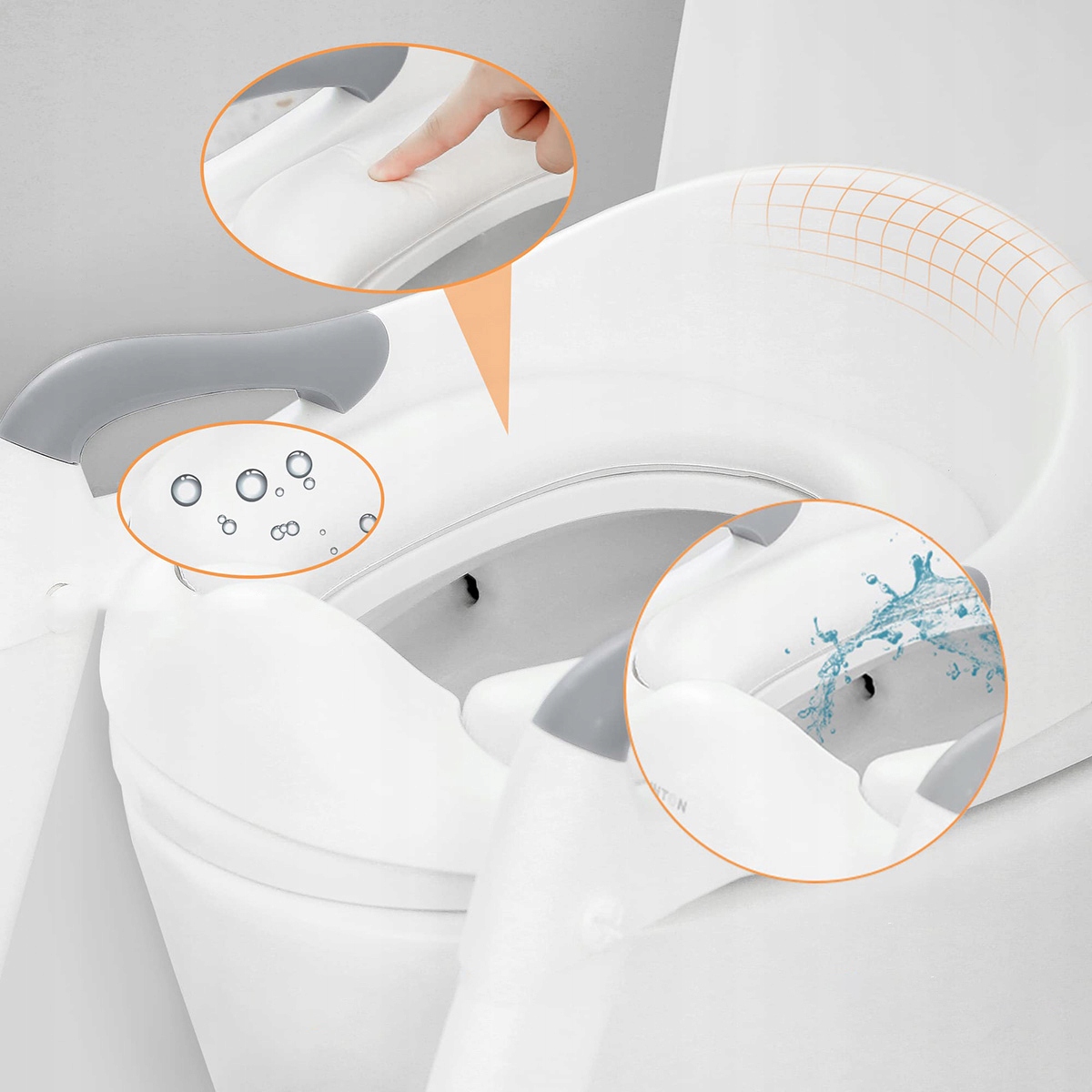 Проект, дружелюбный для детей: благодаря двойным поручникам и широкой педали, ваш ребенок может войти и спуститься в одиночку. Уникальный стиль и классический белый серый цвет позволяют мальчикам и девочкам наслаждаться изучением туалета.