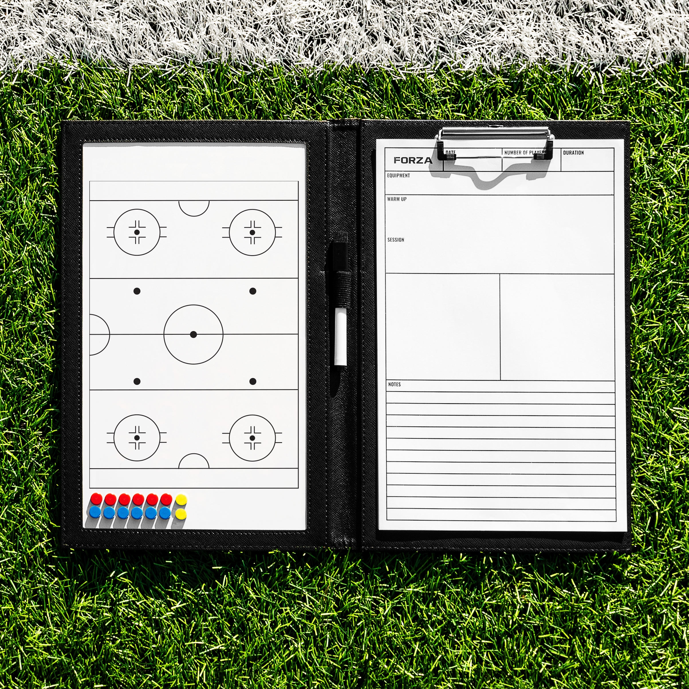 Оснащена всем необходимым тренеру для тактического анализа. На левой стороне портфеля находится доска для сухого стирания из ПВХ с разметкой, а на правой стороне — планировщик матчей/сессий.