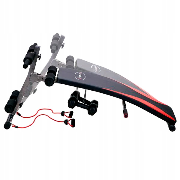 Скамья оснащена двумя гирями по 1,5 кг, покрытыми винилом. Упражнения на верхнюю часть тела также поддерживаются специальными резиновыми тросами.