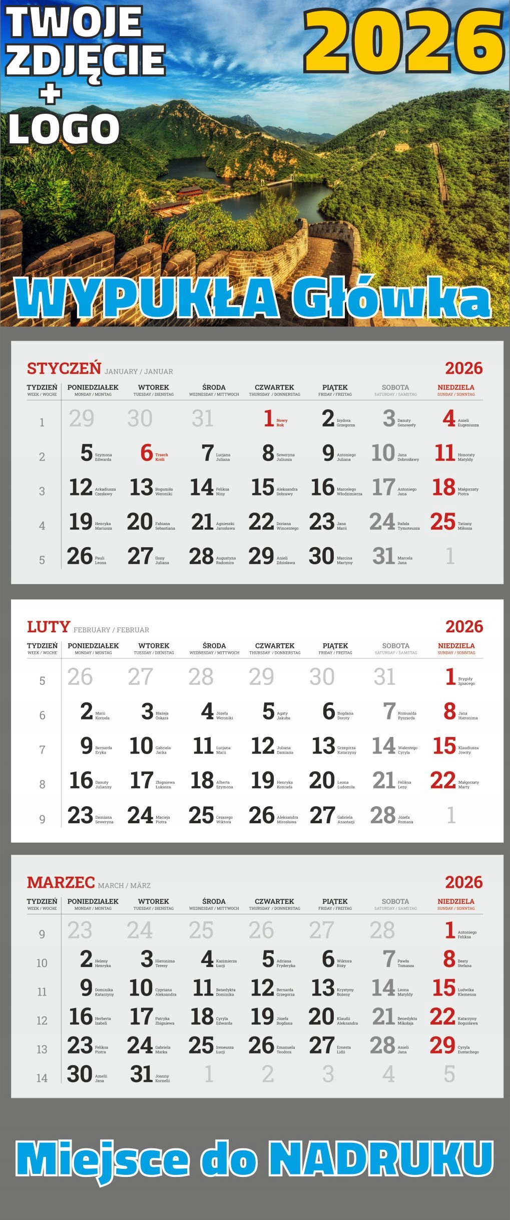 Голова календаря напечатана в полном цвете , что позволяет создавать любой графический дизайн, размещение персонажей компании, фотографий, текстов в любых цветах. Подложка, используемая для печати, представляет собой специальное картон Аляски с весом 250 г, что гарантирует очень хорошее качество цвета . Добавление используемой флэш -фольги явно оживляет цвет и в то же время увеличивает долговечность календаря. В верхней части головы есть отверстие, которое позволяет вам приостановить календарь. Верхний край календаря дополнительно потерян и приклеен, что укрепляет его жесткость. В середине календаря, над календарем, большая линия работает, благодаря которой легко сложить пополам. Головы прикреплены к голове в нейтральном сером цвете .