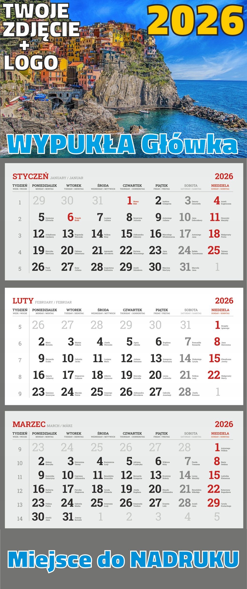 календарь на трех языках ( польский , английский, немецкий), с отмеченными числами и отмеченными именами.