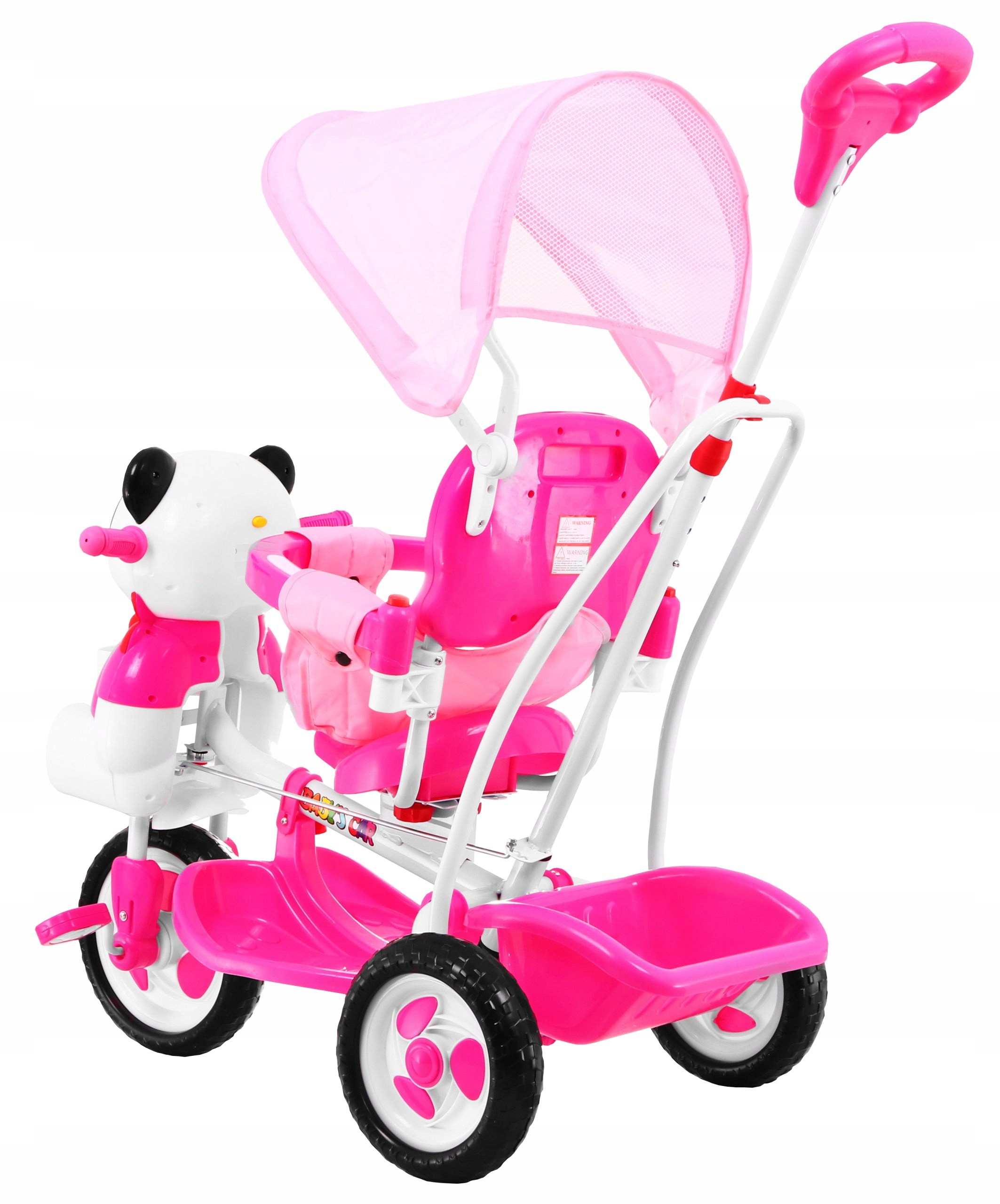 Трехлополитый розовый велосипед Panda + звуки + крыша + барьер