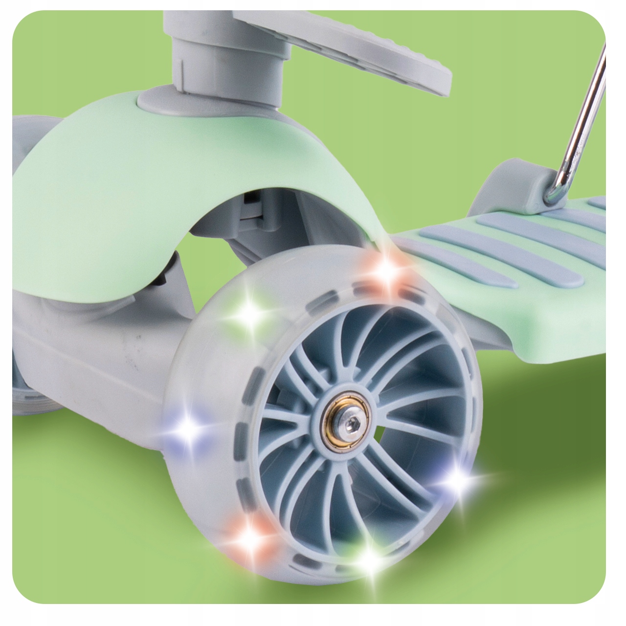 Уникальные передние колеса с светодиодной подсветкой придают скутеру уникальный персонаж. Светодиодные огни активируются во время вождения, что не только делает ребенка радостью, но и увеличивает его видимость на дороге или тротуаре. Благодаря этому скутер сочетает в себе веселье и безопасность, делая каждую поездку еще более захватывающей!