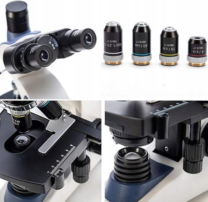 4 Ахроматические линзы DIN, установленные в роторной башне, предлагают 6 Уровни увеличения: 40x, 100x, 250x, 400x, 1000x, 2500x.