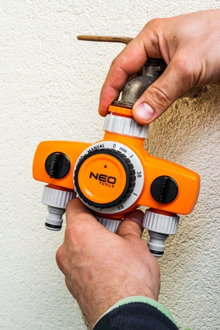 Распределитель трехклапанный, 2 выхода с замком, один с таймером 15-750 производства NEO - подключение к трем оросительным каналам, позволяющее подключение к кранам с резьбой 26,5 мм (3/4") или 33,1 мм (1").