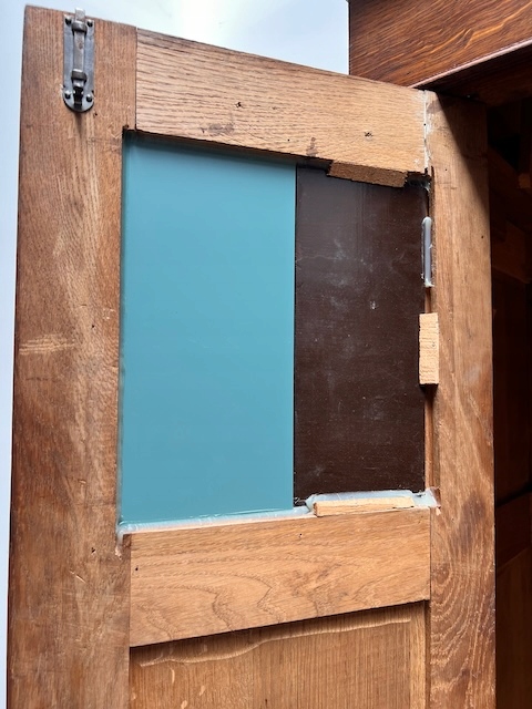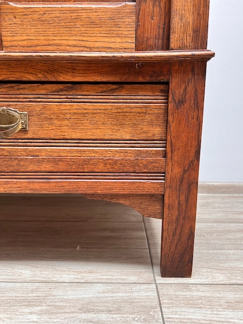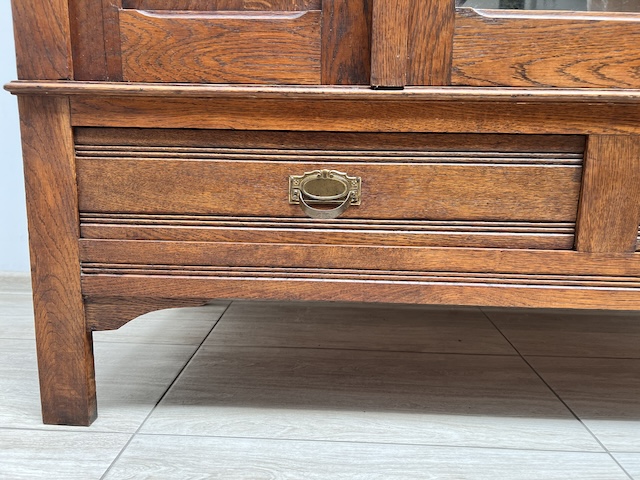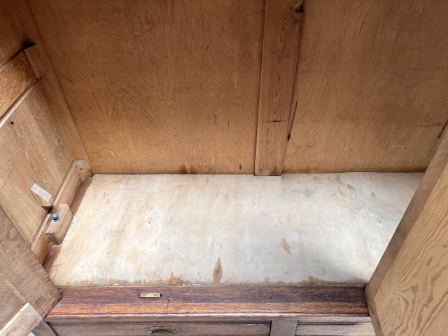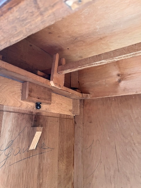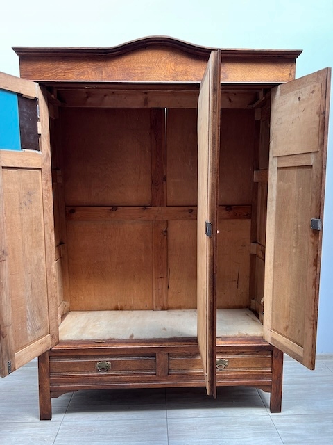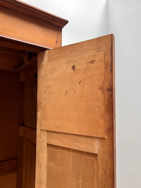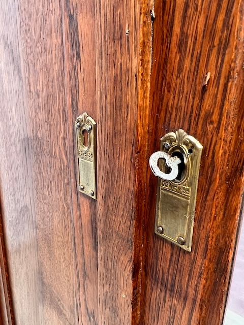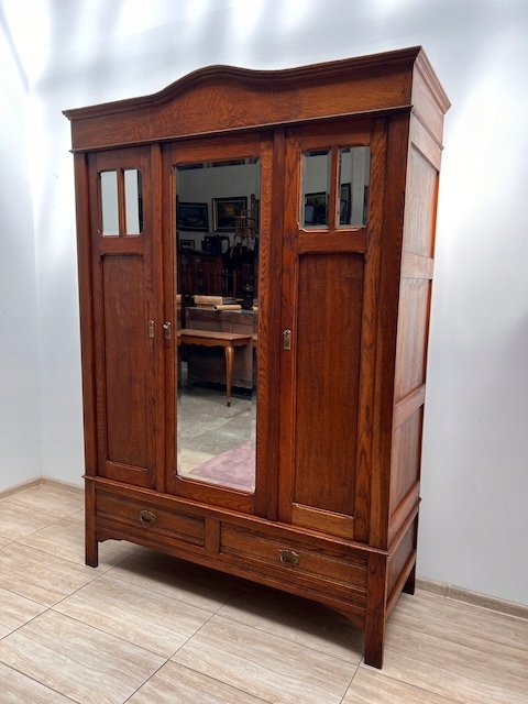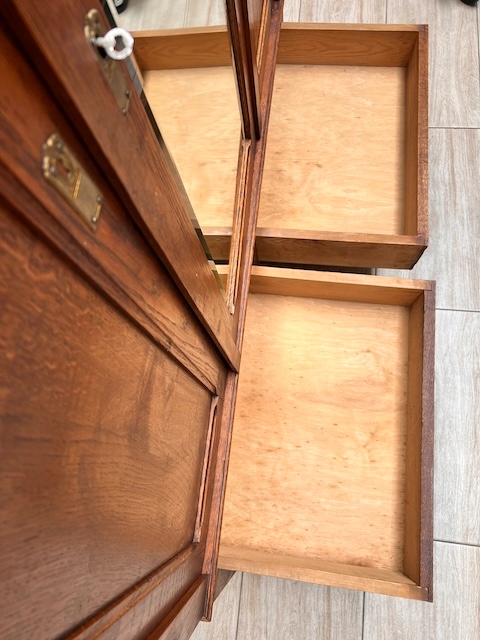 Шкаф трехдверный. Дефектов и повреждений нет, но имеются следы использования. Зеркала оригинальные со скошенной кромкой, за исключением маленького правого зеркала в левой двери. Он заменяется и не скашивается. Большое зеркало не идеально; на нем есть маленькие точки и тонкие полоски. Замки функциональные, с набором ключей. На двух задних пластинах имеются старые неактивные следы молотков. Шкаф разбирается и по частям приедет новому владельцу. Он готов к вставке.