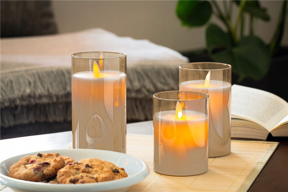 Трехэлементная восковая светодиодная свеча, установленная в банке, золотопрозрачный