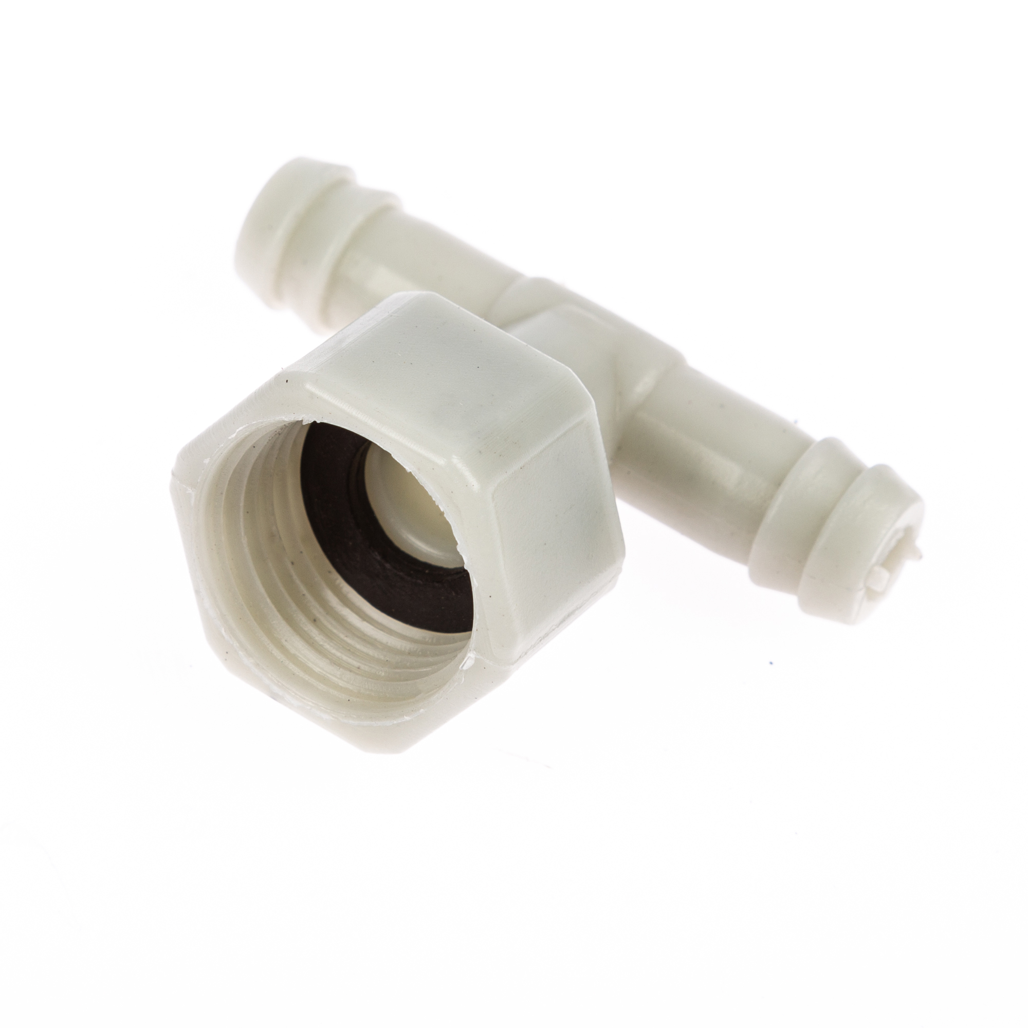 Тройник имеет присоединительную резьбу под насадку 1/2" и штуцер под резиновый шланг с внутренним диаметром 10 мм. Поскольку тройник имеет наиболее распространенные присоединительные размеры, он будет использоваться во многих продукты, доступные на рынке.
