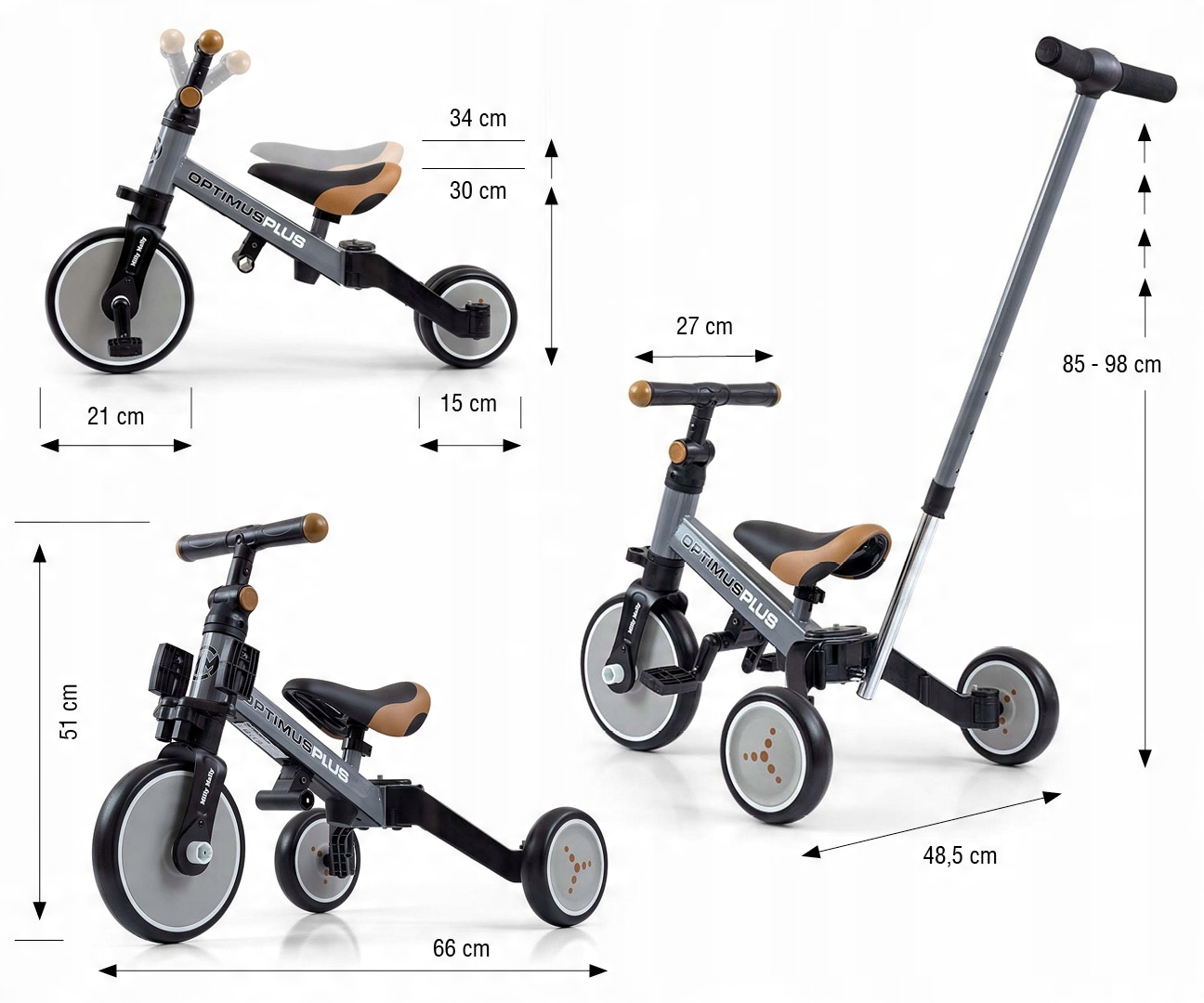 Optimus Plus был разработан, чтобы стать одним из лучших вариантов первого транспортного средства вашего ребенка. Благодаря устойчивой трехколесной конструкции он обеспечивает ребенку соответствующий уровень безопасности и облегчает приобретение новых навыков. Когда ребенок уже освоил азы катания и не требует помощи родителей в управлении ручкой, мы можем добавить педали или превратить его в классический беговел.