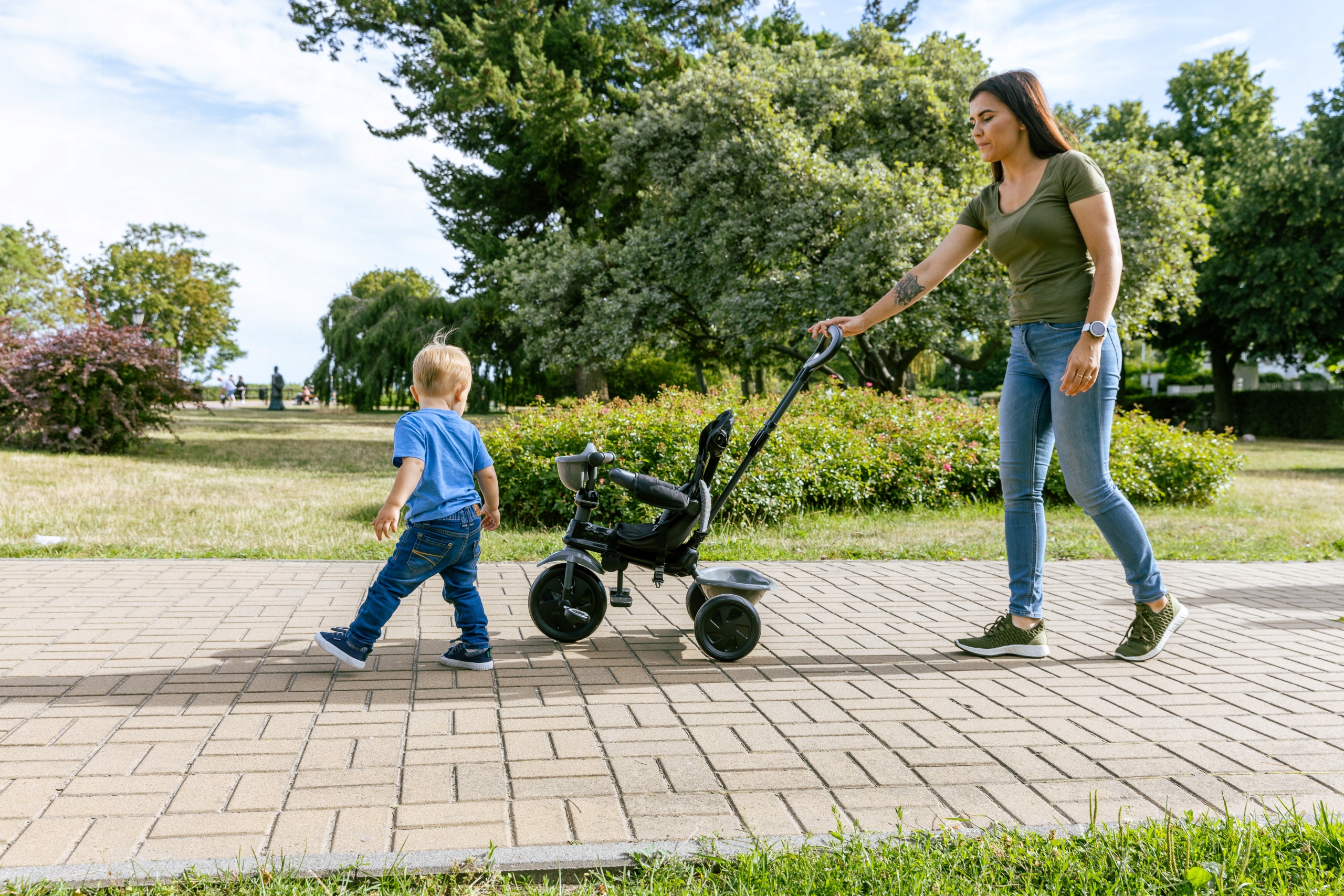Уникальный съемный и регулируемый велосипед Характеристики гарантируют, что у вашего малыша будет идеальная коляска на каждом этапе его развития. Велосипед QPlay Cozy 4-в-1 превращается из плавной, управляемой родителями, в независимую коляску для одиночных приключений. По мере того, как ваш ребенок растет, вы можете превратить подножки в педали, регулируя и снимая родительскую ручку и опору для спины в соответствии с потребностями вашего ребенка. QPlay Cozy 4-в-1 развивается в четыре этапа, чтобы вашему малышу было легче самостоятельно крутить педали.
