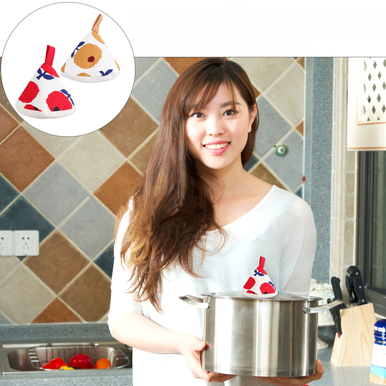 ✅Это набор из 2 чехлов для прихваток, изготовленных из хлопка высочайшего качества, треугольной формы и с отверстием для подвешивания, легко надеваемых. С помощью этой накладки вы сможете защитить руки от ожогов, когда держите горячую посуду или крышки кастрюль. Хорошие мини-кухонные перчатки для друзей.