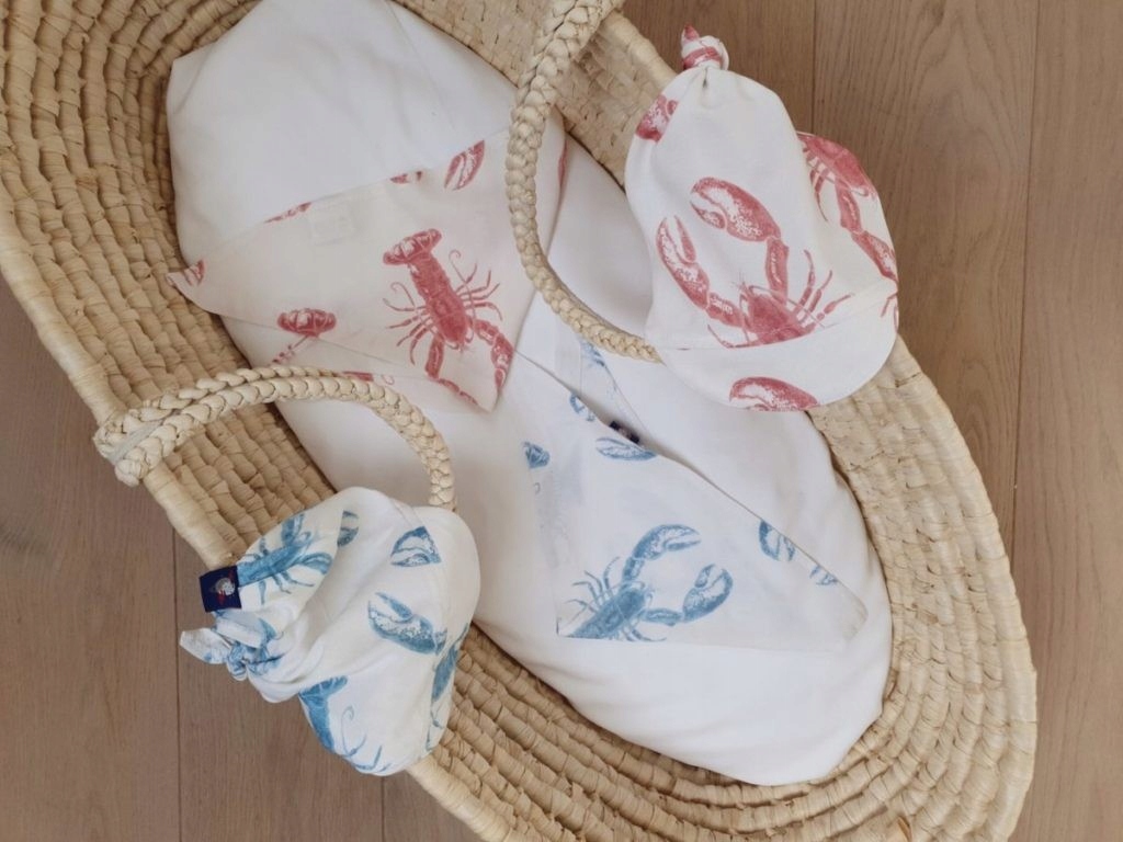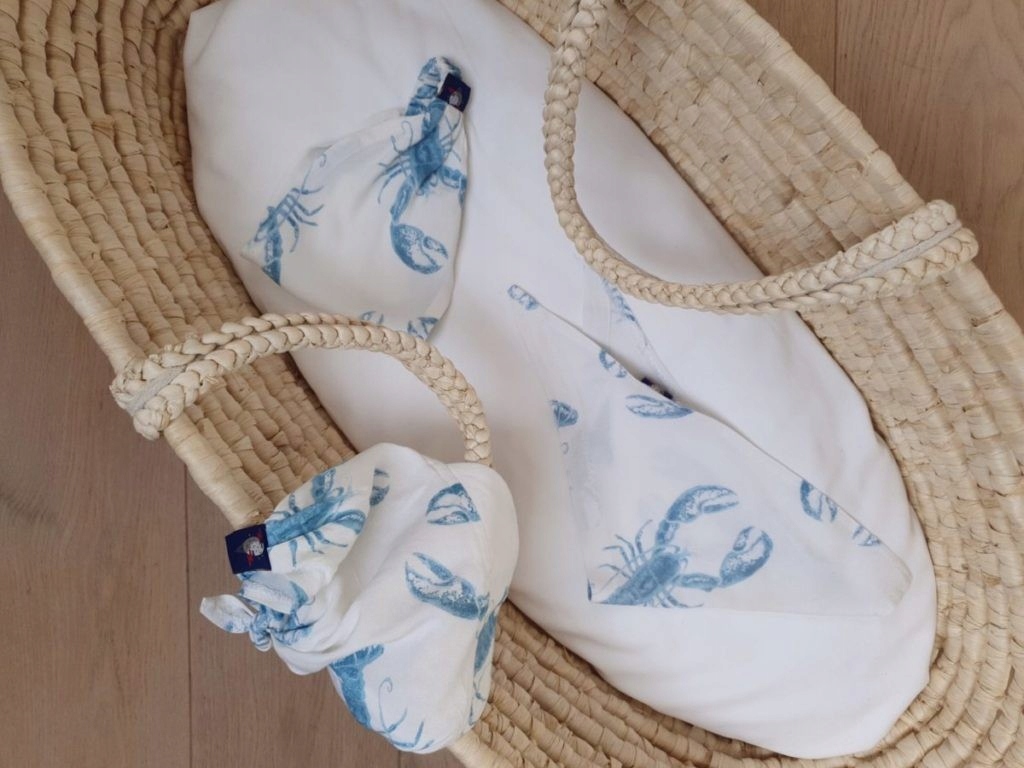 Детский шейный платок отлично смотрится с головным убором из этой же коллекции. Линия Lobster Vibes доступна в двух цветах: BLUE и STRAWBERRY PINK, также в нее входит шарф с козырьком и повязка на голову. В коллекцию New Hampton Lobster Vibes также входят летние аксессуары для постельного белья — спальные мешки, пеленки и тонкое постельное белье.