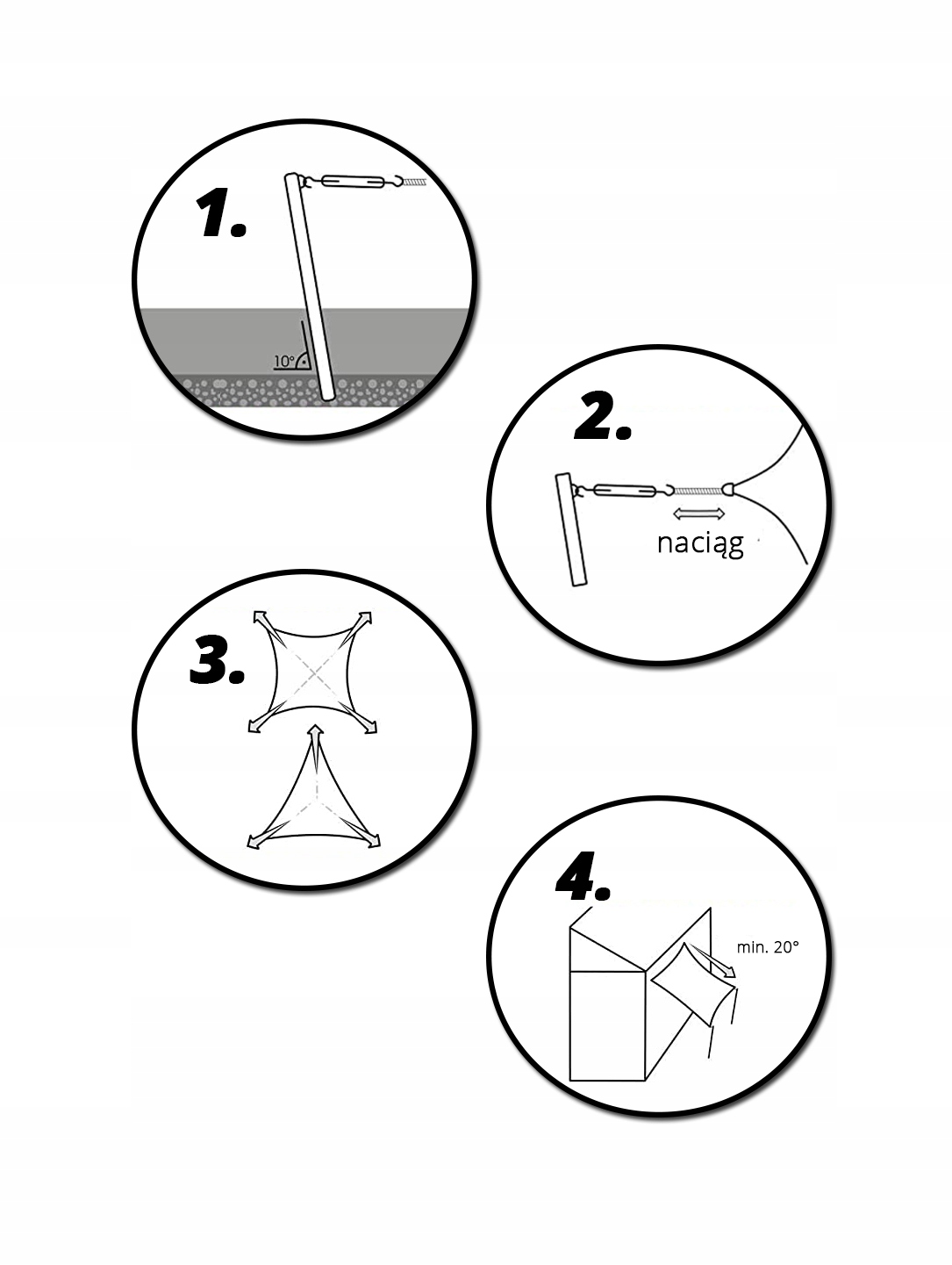 Для достижения оптимального натяжения и устойчивости парусные мачты должны быть наклонены примерно на 10° по отношению к направлению натяжения. Запланируйте соответствующее расстояние, чтобы обеспечить постоянное натяжение парусов.