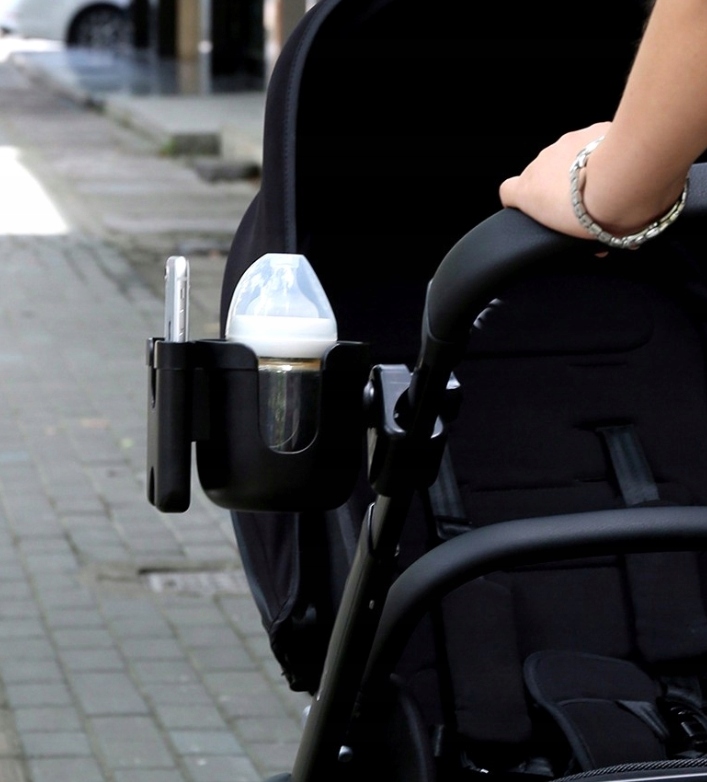 Держатель для бутылок оснащен органайзером для мобильного телефона, который позволяет держать мобильный телефон и держать руки свободными. Он позволяет катать коляску, держа в руках телефон и кофе.