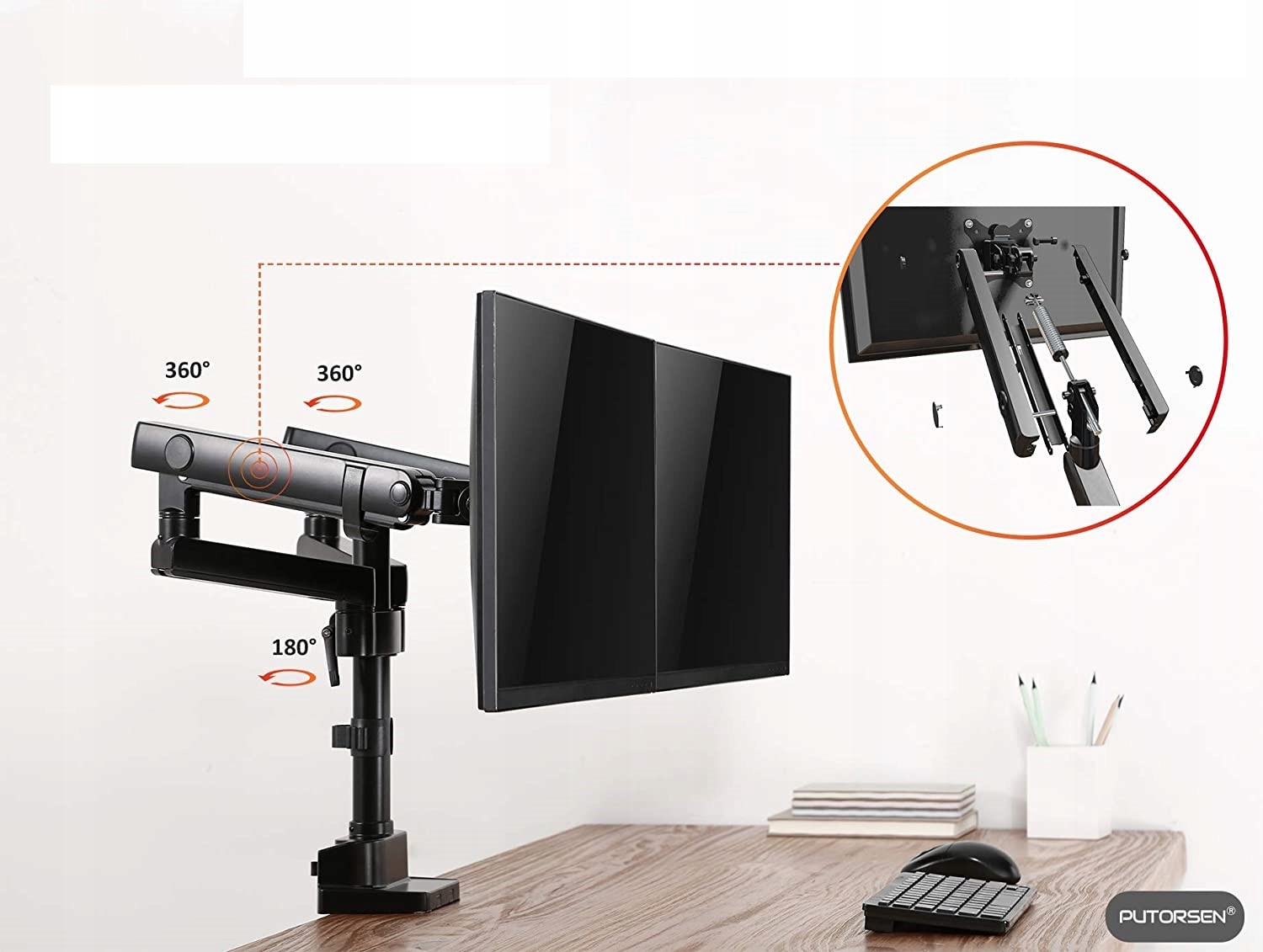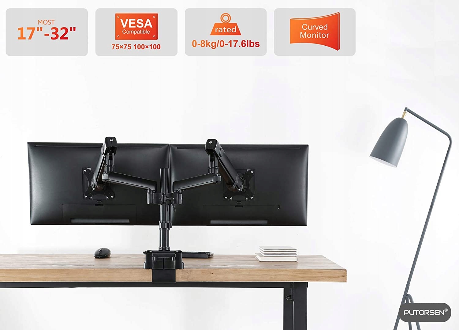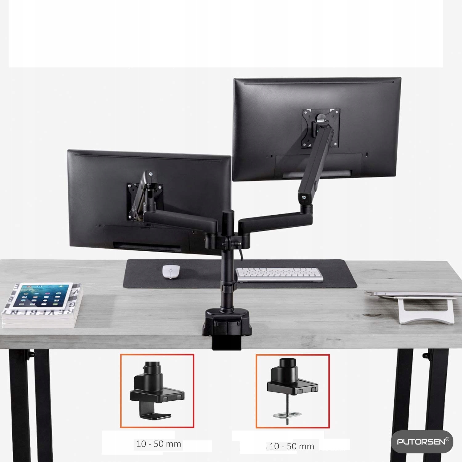 Выставочный кронштейн для установки двух мониторов PUTORSEN Настольное крепление для монитора, 2 монитора, алюминий, эргономичный, наклоняемый, регулируемый по высоте, держатель для двух светодиодных ЖК-экранов 17"-32" - VESA 75 x 75 - 100 x 100 мм, 8 кг/рука