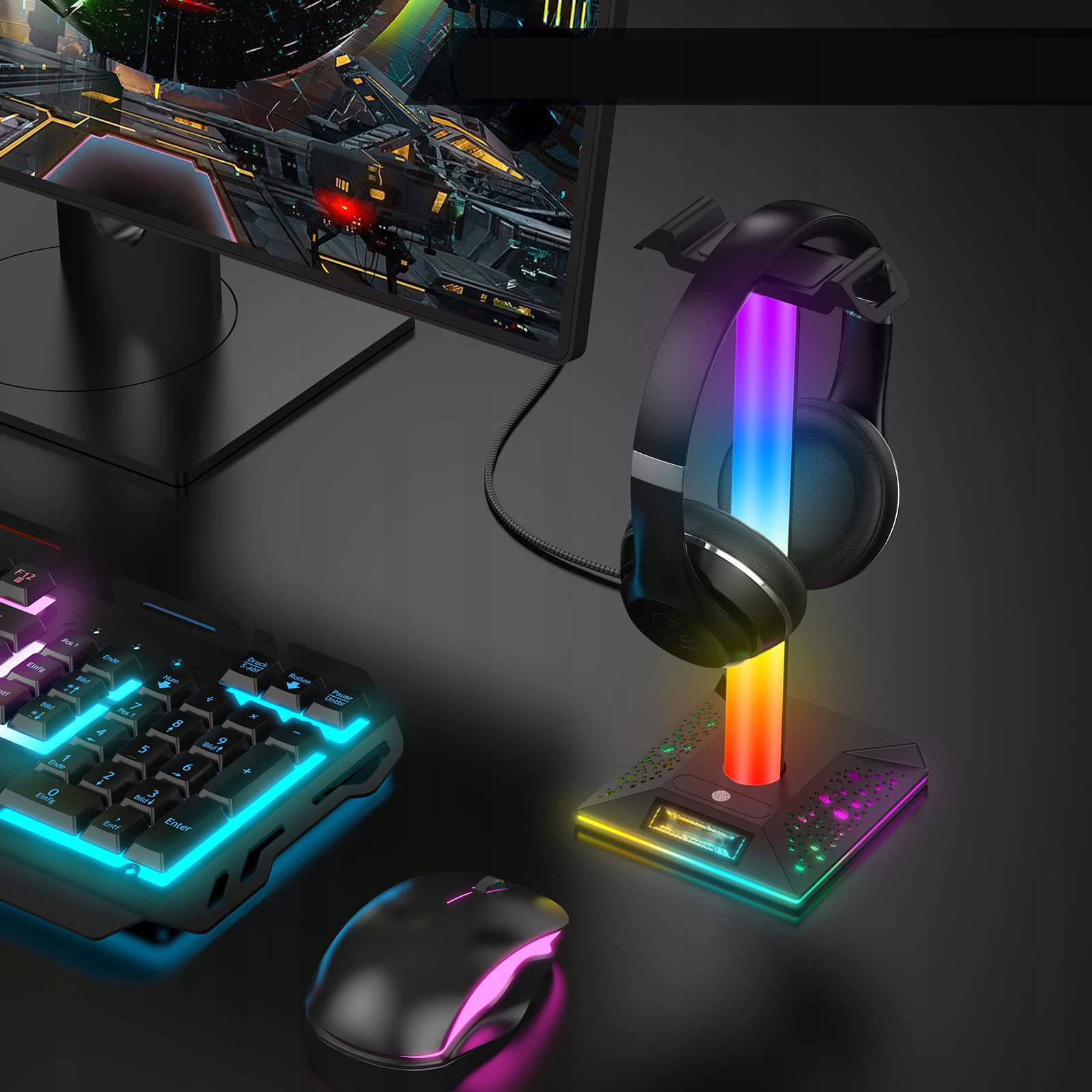 Подставка для наушников RGB с ярким и ослепительным световым эффектом создает крутую и восторженную атмосферу для юных геймеров, которые любят компьютерные игры. Идеальные игры настольные аксессуары для вашей гостиной. Идеальный подарок для сыновей, мальчиков, мужчин и геймеров.