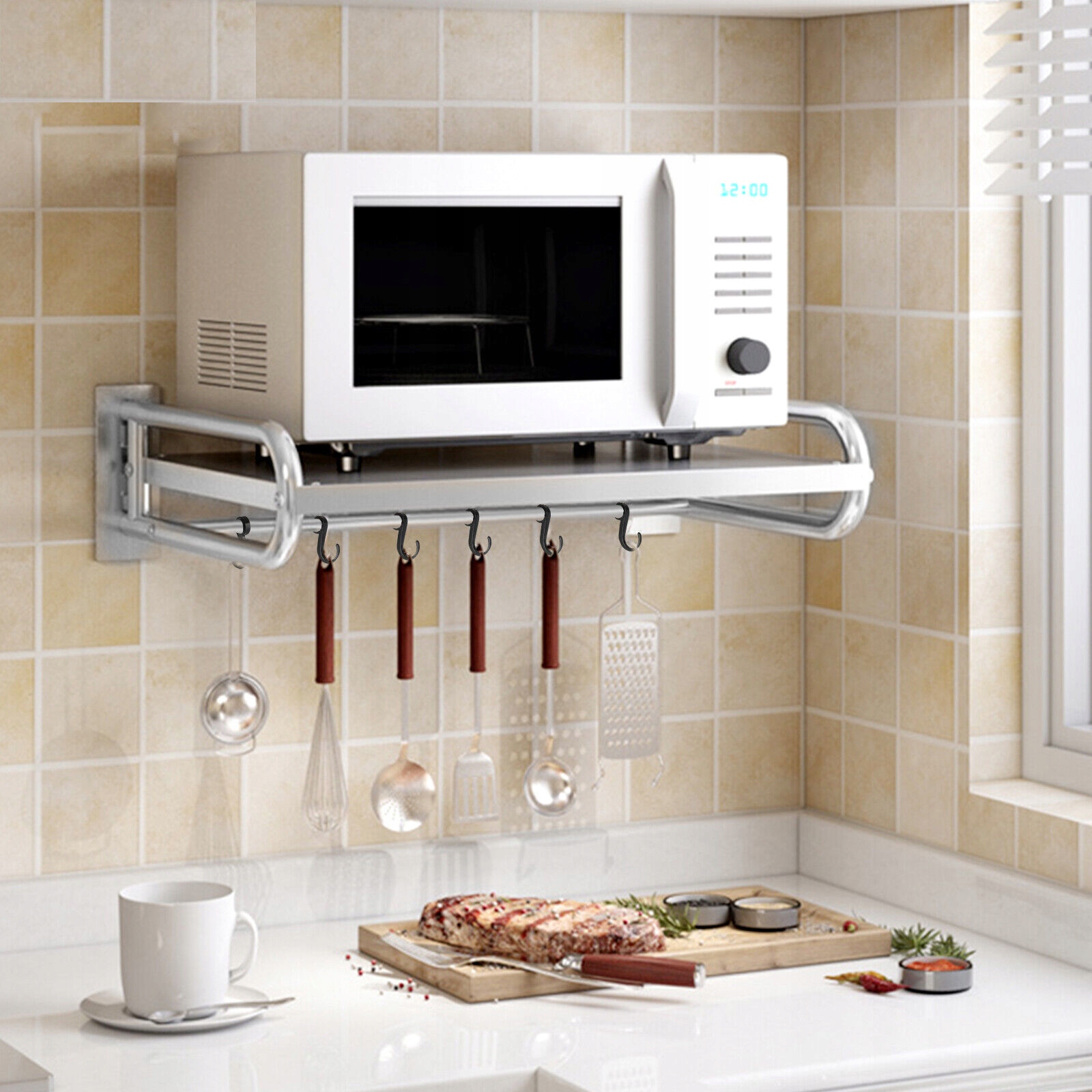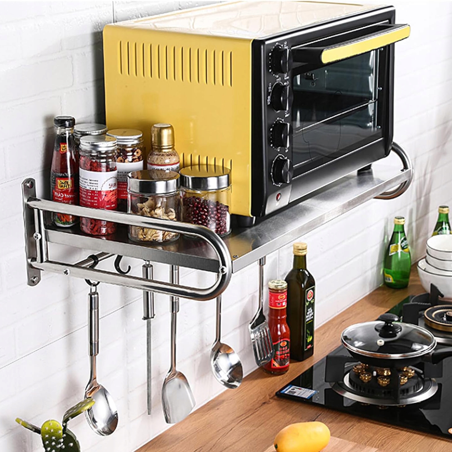 ☀ Экономия места:Подставку для микроволновой печи можно разместить на любой плоской поверхности, чтобы сэкономить место на кухне, предоставив дополнительное пространство в ограниченном пространстве. С крючками для более удобного хранения и хранения микроволновую печь или духовку можно разместить на верхней полке. Крючки можно использовать для размещения кухонных принадлежностей, таких как ножи и ложки, чтобы поддерживать чистоту и порядок на кухне.