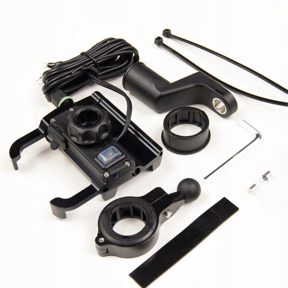 - Возможность установки держателя на руль или под винт зеркала делает его чрезвычайно универсальным и подходит для большинства мотоциклов.