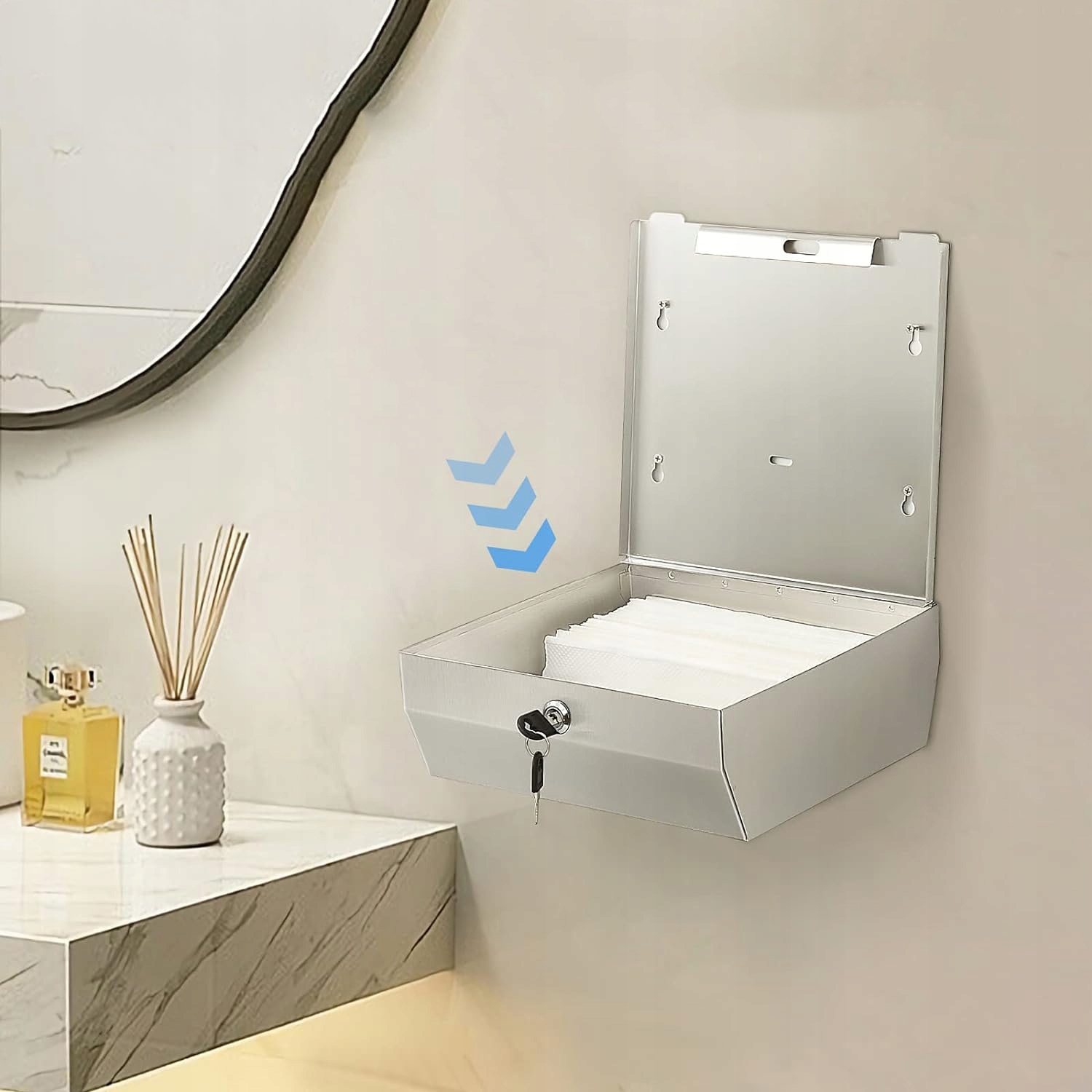 ➡️ Большая вместимость: Вмещает примерно 250–400 многоразовых бумажных полотенец, поэтому каждый может получить однократную выдачу бумажных полотенец для гостей без частой замены. Легкое заполнение с помощью запирающего ключа.
