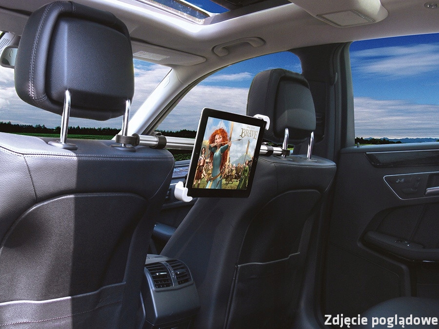 Универсальный автомобильный держатель для планшетов, крепящийся между сиденьями к кронштейнам подголовников на сиденьях водителя и пассажира.