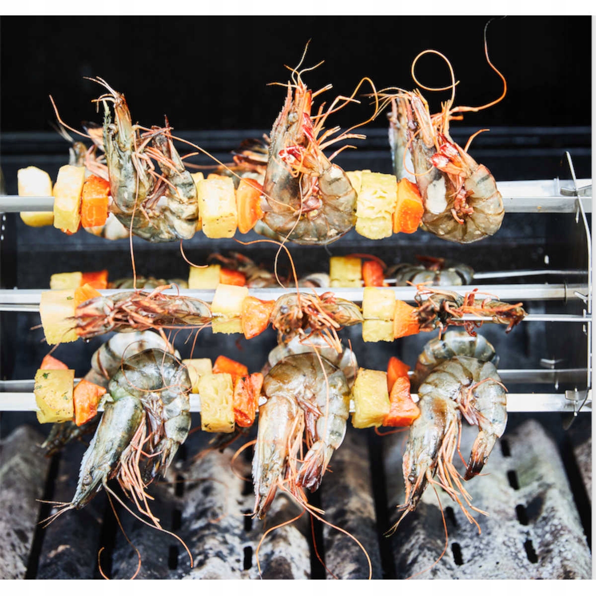 Собрать вертел SANTOS XXL с помощью лопаток очень просто: достаточно вставить круглые крепления в отверстия и прикрепить их к вертелу двумя винтами справа и слева. Затем вы можете загрузить 6 очень больших лопат XXL едой и поместить их в монтажные отверстия.