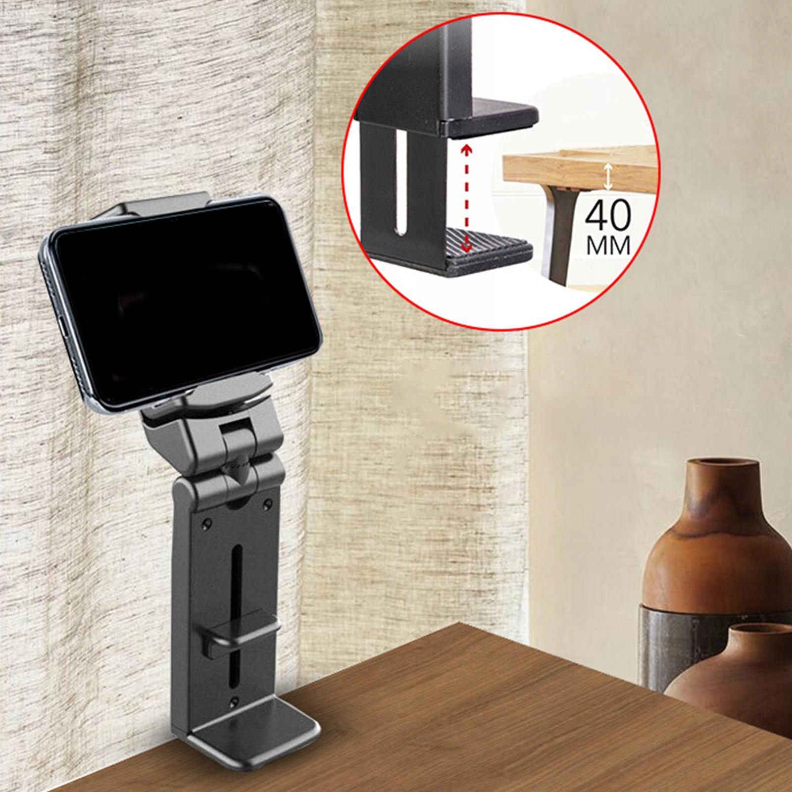 Везде: регулируемое подпружиненное зажимное основание подходит для устройств толщиной до 1,57 дюйма. Его можно прикрепить к столу, стулу, шкафу, изголовью кровати, столику в самолете и даже к ручке багажа.