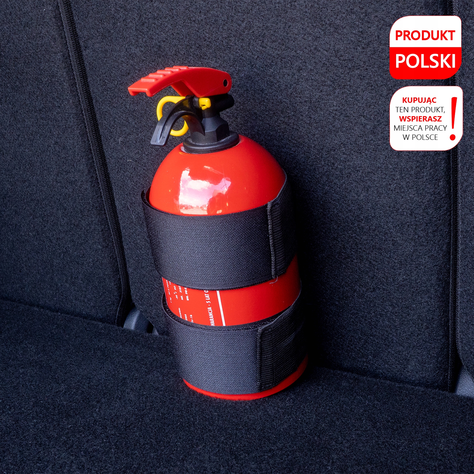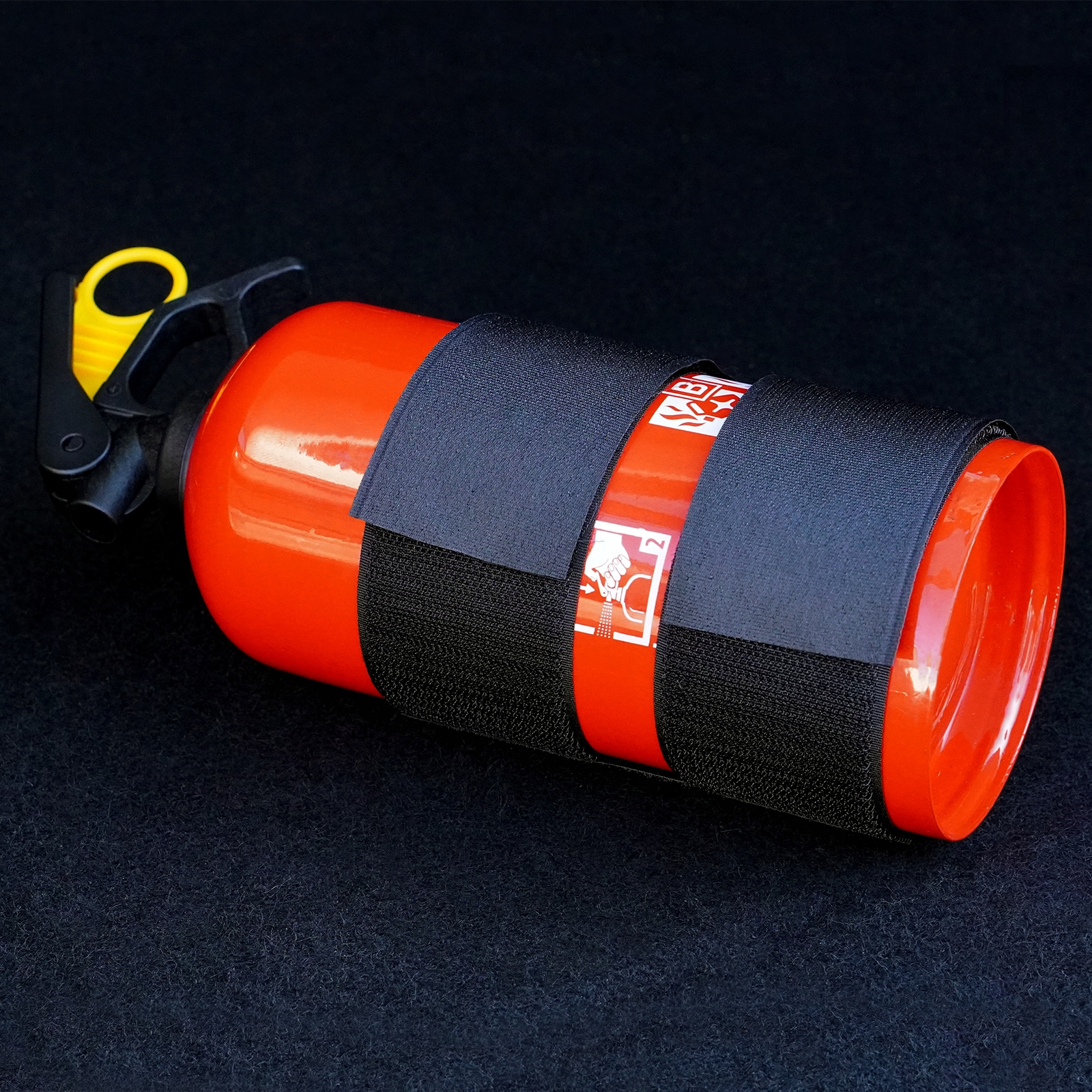 Удобная липучка для крепления автомобильного огнетушителя. Благодаря использованию резинки и большой липучки размещенный внутри огнетушитель не перемещается.