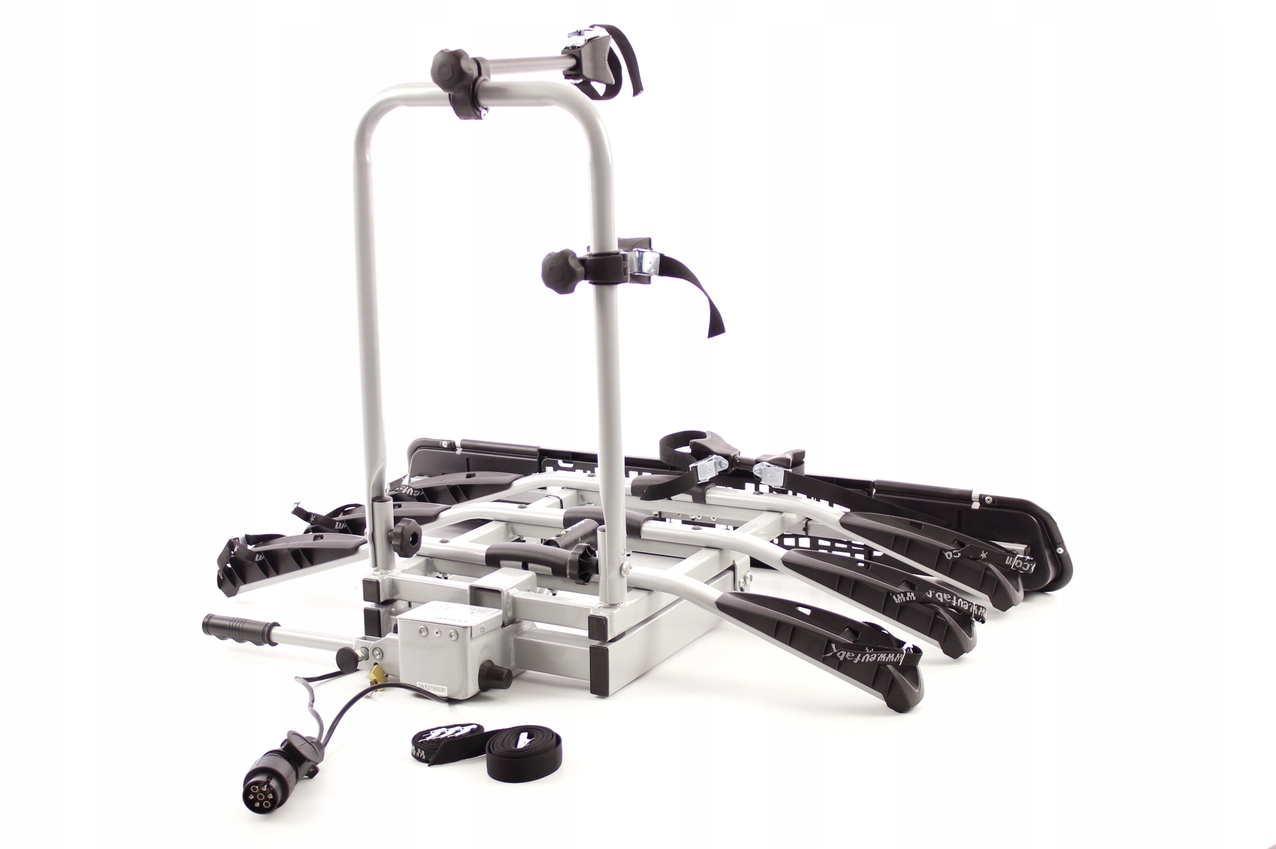 - Стойка-велосипедная платформа оснащена электрожгутом с 13-контактной вилкой (переходником с понижением 7/13 также входит в комплект). Таким образом, багажник оснащен всеми необходимыми правилами освещения, включая фонари заднего хода и противотуманные фары.