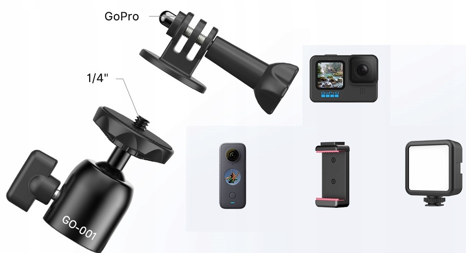 - спортивными камерами GoPro / SJCAM / Xiaomi / DJI / INSTA360 и всеми другими камерами со стандартным креплением GoPro.