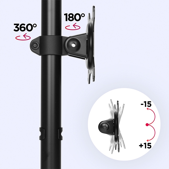 - Данная модель держателя позволяет наклонять монитор на -15°/+15° и поворачивать его вправо-влево на 180° по горизонтали и на 360° вокруг собственной оси. Зажим открывается на 68 мм — перед покупкой проверьте ширину вашего стола. Данная модель относится к серии DM15 – она изготовлена из высококачественных стальных комплектующих. В комплект входят все аксессуары, необходимые для сборки кронштейна.