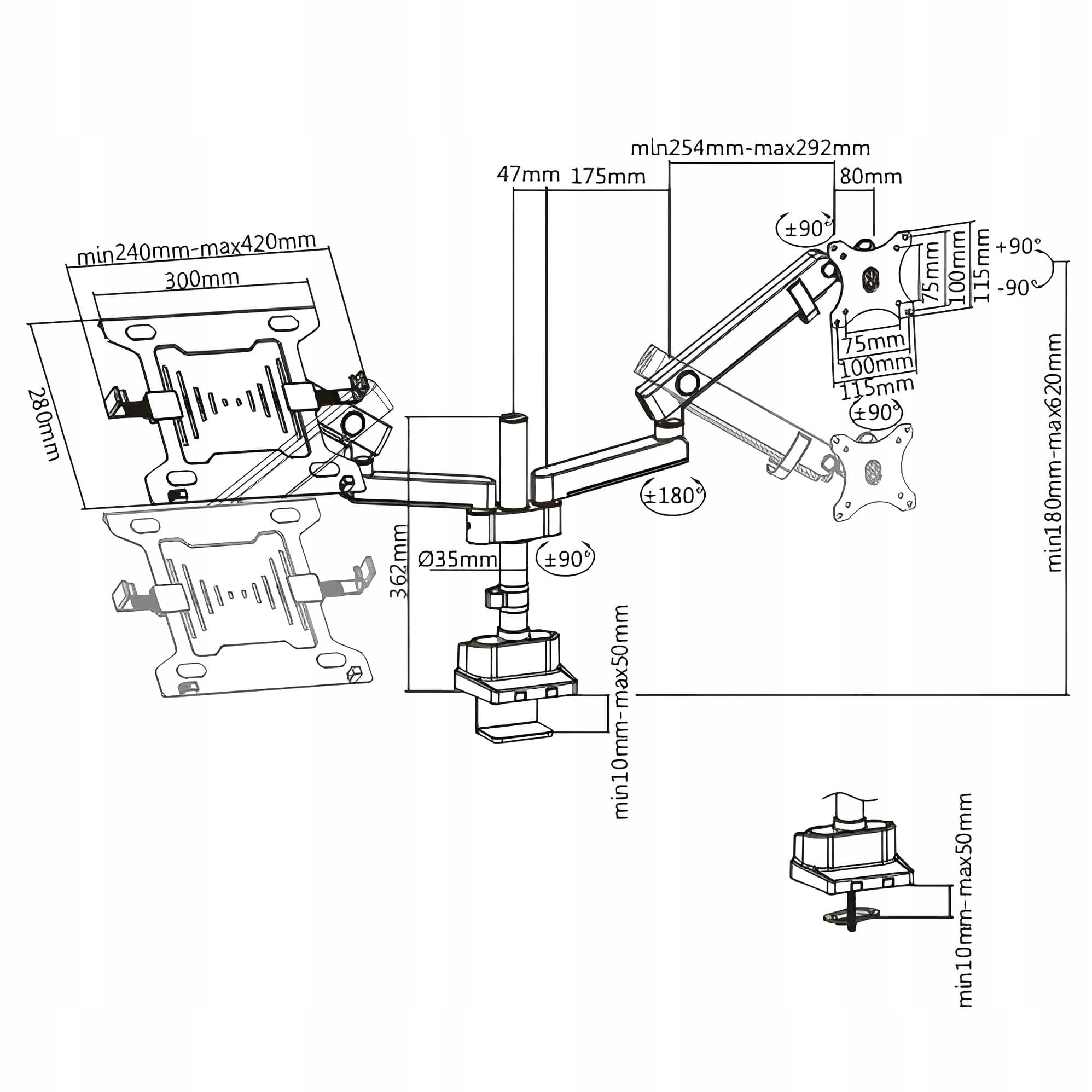 Тримач для монітора вагою 8 кг і ноутбука вагою 4,5 кг, кріплення за допомогою довгого затискача VESA