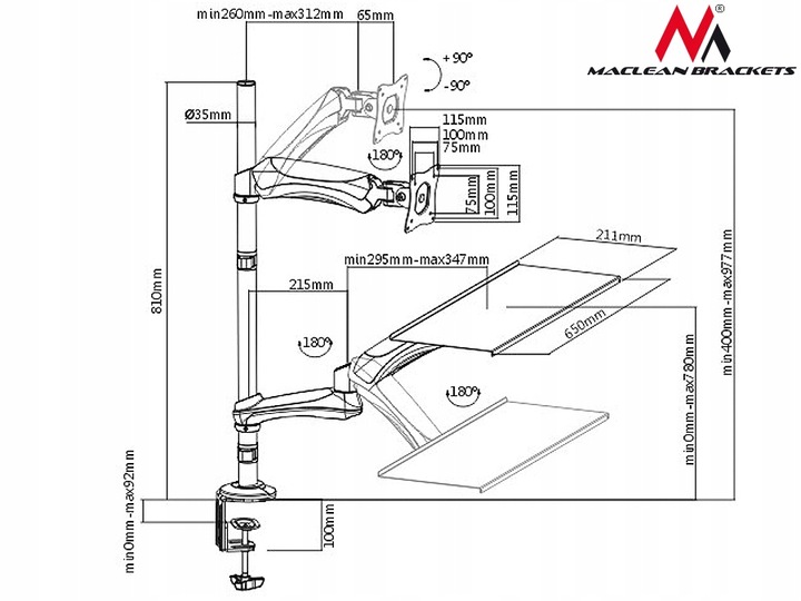 Смена положения сидя в положение стоя обеспечивает высокий комфорт при работе и оптимизирует эргономику. Кронштейн изготовлен из высококачественного алюминия и оснащен прочным крепежным зажимом, позволяющим крепить его к столешнице или другим плоским поверхностям. Идеально подходит для использования, среди прочего: в офисе и дома — без сверления.