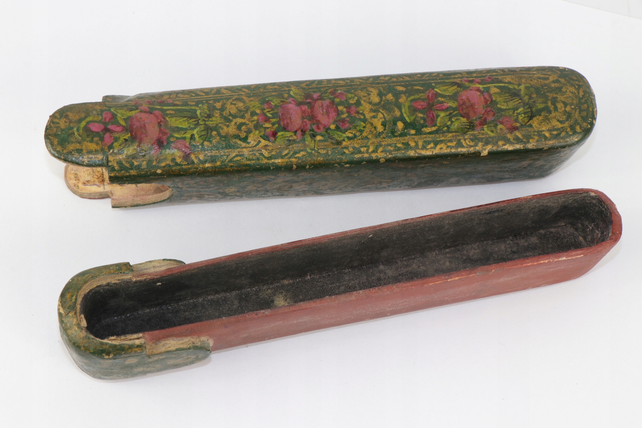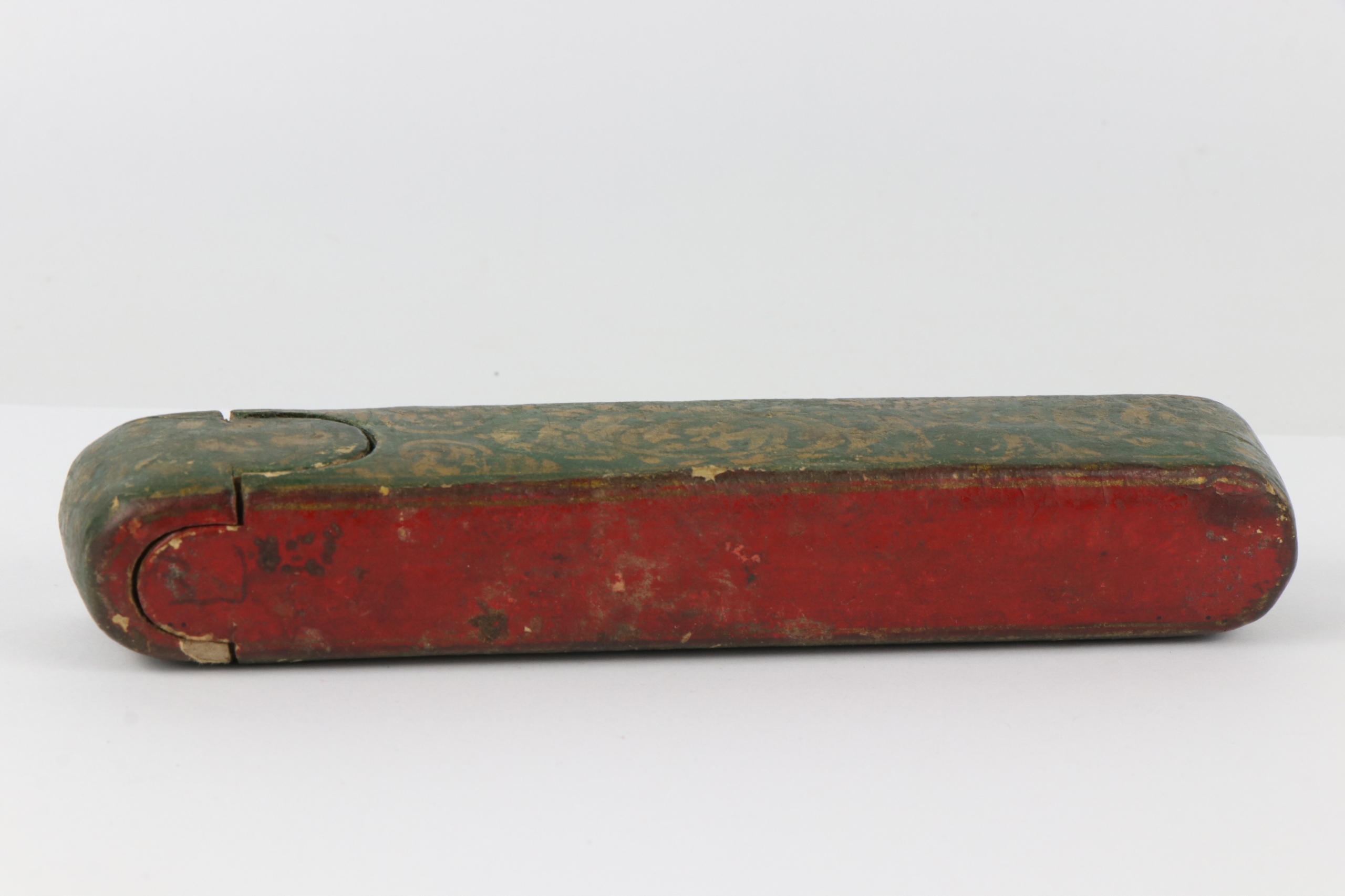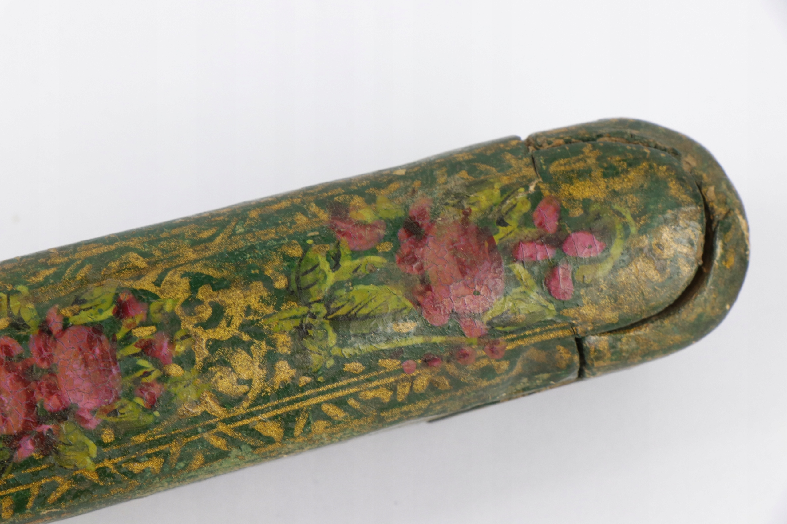 Очень старый персидский контейнер для ручек Каламандан периода династии Каджаров 1794-1925 годов. Контейнер изготовлен из папи-маше, покрыт. ручная роспись орнамента. Цветочные и геометрические украшения. Низ окрашен в красный цвет, внутри темно-синий.