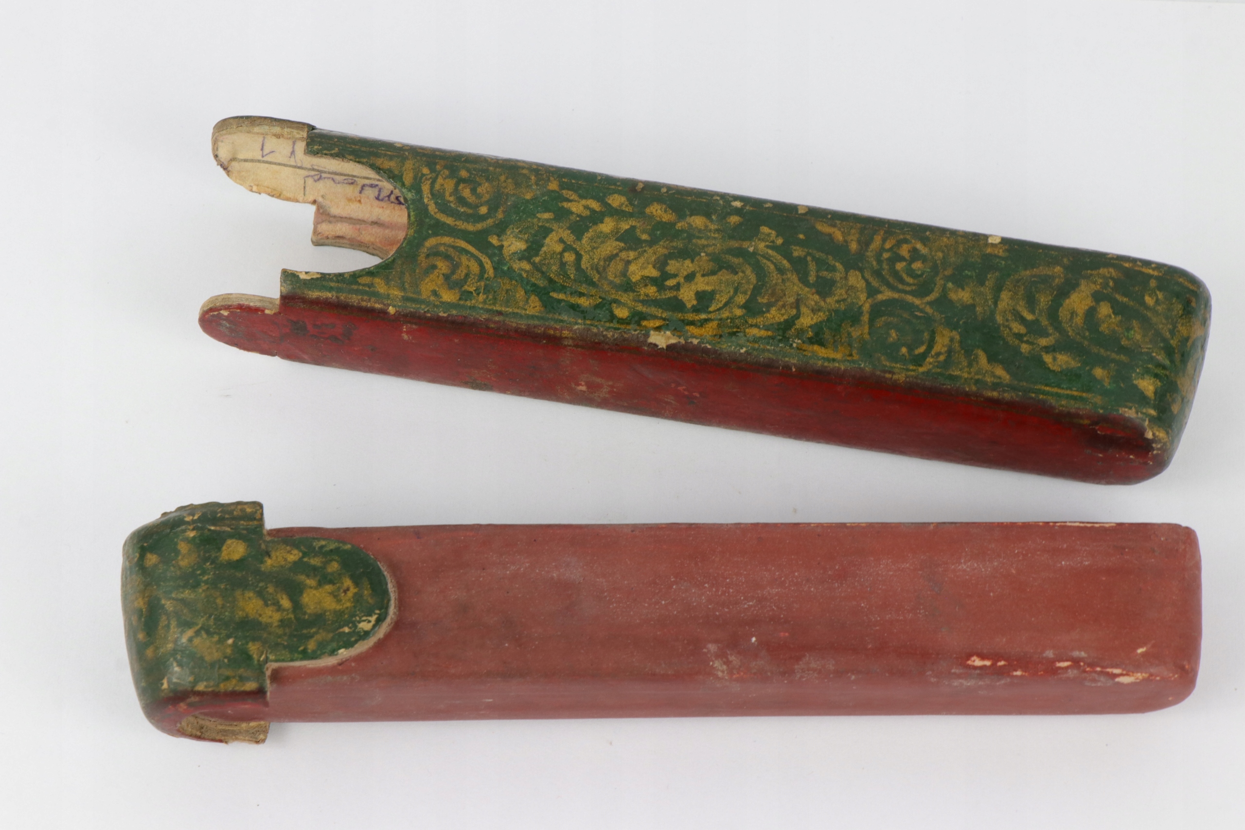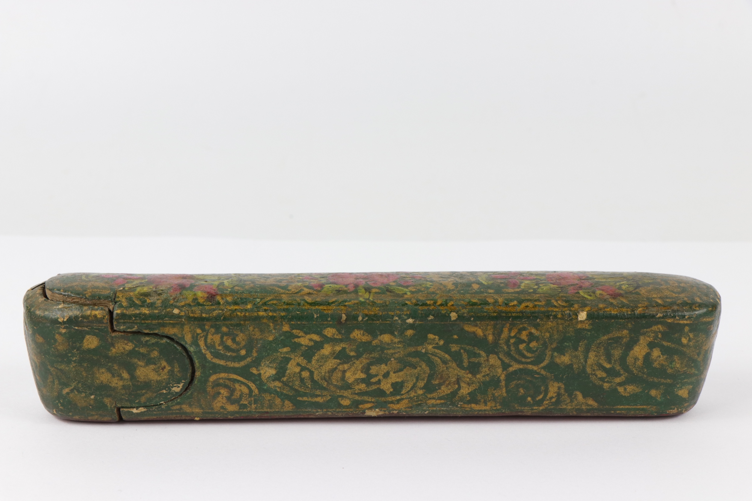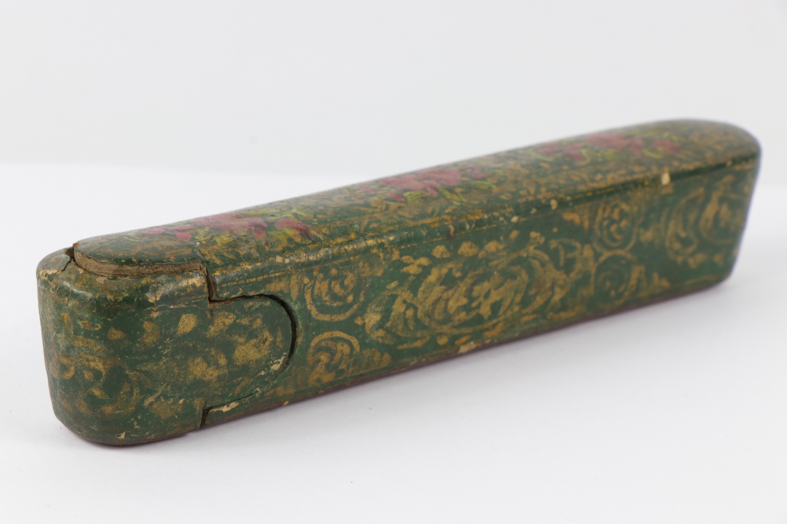 Очень старый персидский контейнер для ручек Каламандан периода династии Каджаров 1794-1925 годов. Контейнер изготовлен из папи-маше, покрыт. ручная роспись орнамента. Цветочные и геометрические украшения. Низ окрашен в красный цвет, внутри темно-синий.