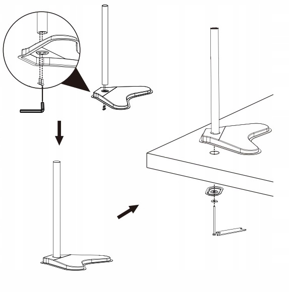 Крепить основание к столешнице необходимо через отверстие в столе (минимум 6 мм)