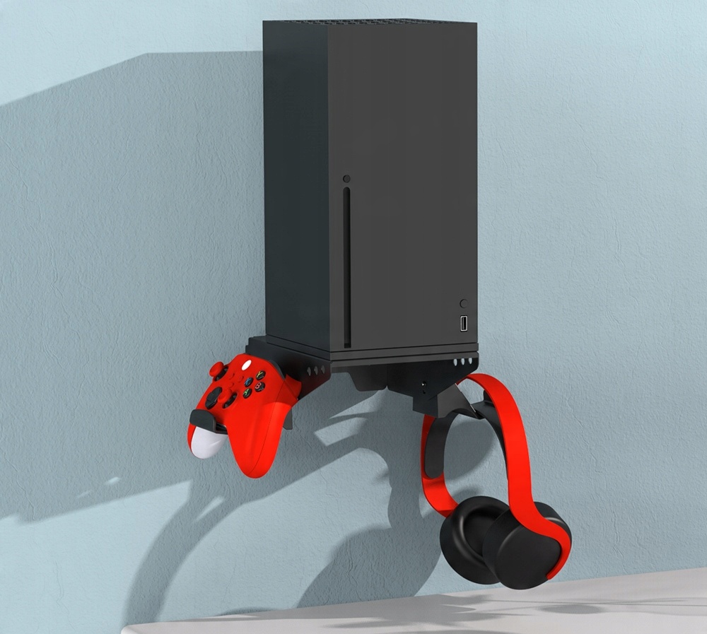 Держатель, с помощью которого можно закрепить консоль Xbox Series X на стене. В комплект также входят 2 держателя для пэдов и наушники, которые можно закрепить двумя способами: прикрутив их к держателю или к стене.