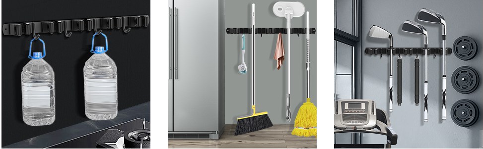- С этим Настенный держатель для метел и швабр позволяет организовать чистящие средства, садовые инструменты, спортивный инвентарь, кухонную утварь, аксессуары для ванной комнаты и металлические инструменты.