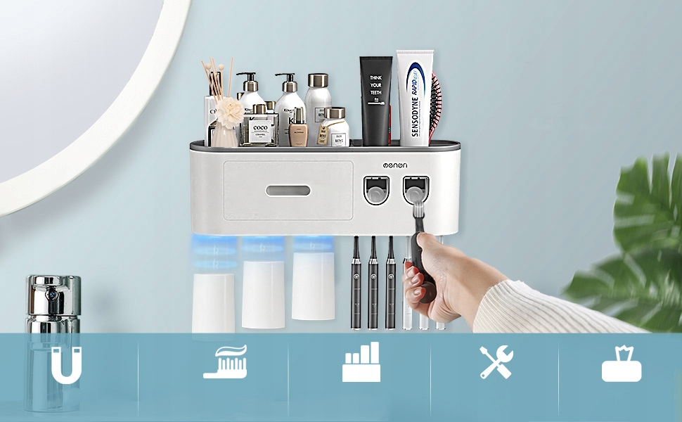 - с awia 2 чашками имеет пространство для 6 зубных щетков , верхняя полка для хранения аппаратов для бритья, машин для бритья, лиц мыть гель и косметику макияжа и ящик для других аксессуаров. дренаж , эффективно поддержание сухой и чистой воды, что делает его более гигиеничным и здоровым.