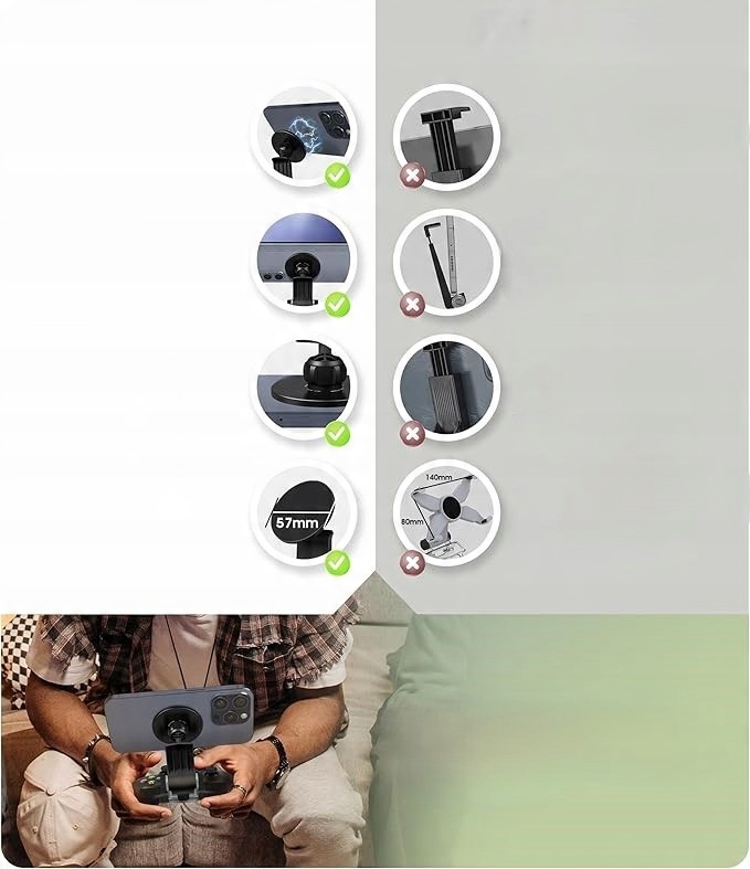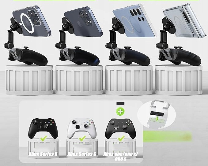 - Широкая совместимость: наш продукт включает в себя усовершенствованный магнитный адаптер N52, который идеально работает с iPhone 12 и более новыми моделями, оснащенными технологией Mag-Safe, а также чехлы для телефонов со встроенным металлическим кольцом. Для iPhone 11, более старых моделей, телефонов Android и даже более крупных складных телефонов просто прикрепите прилагаемое металлическое кольцо для обеспечения полной совместимости. Зажим контроллера разработан специально для контроллеров Xbox Series X/S и One/One S/One X, он не совместим с другими контроллерами