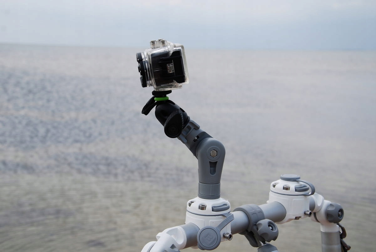 Адаптер имеет шарниры, позволяющие гибко позиционировать фотоаппарат или фотокамеру.