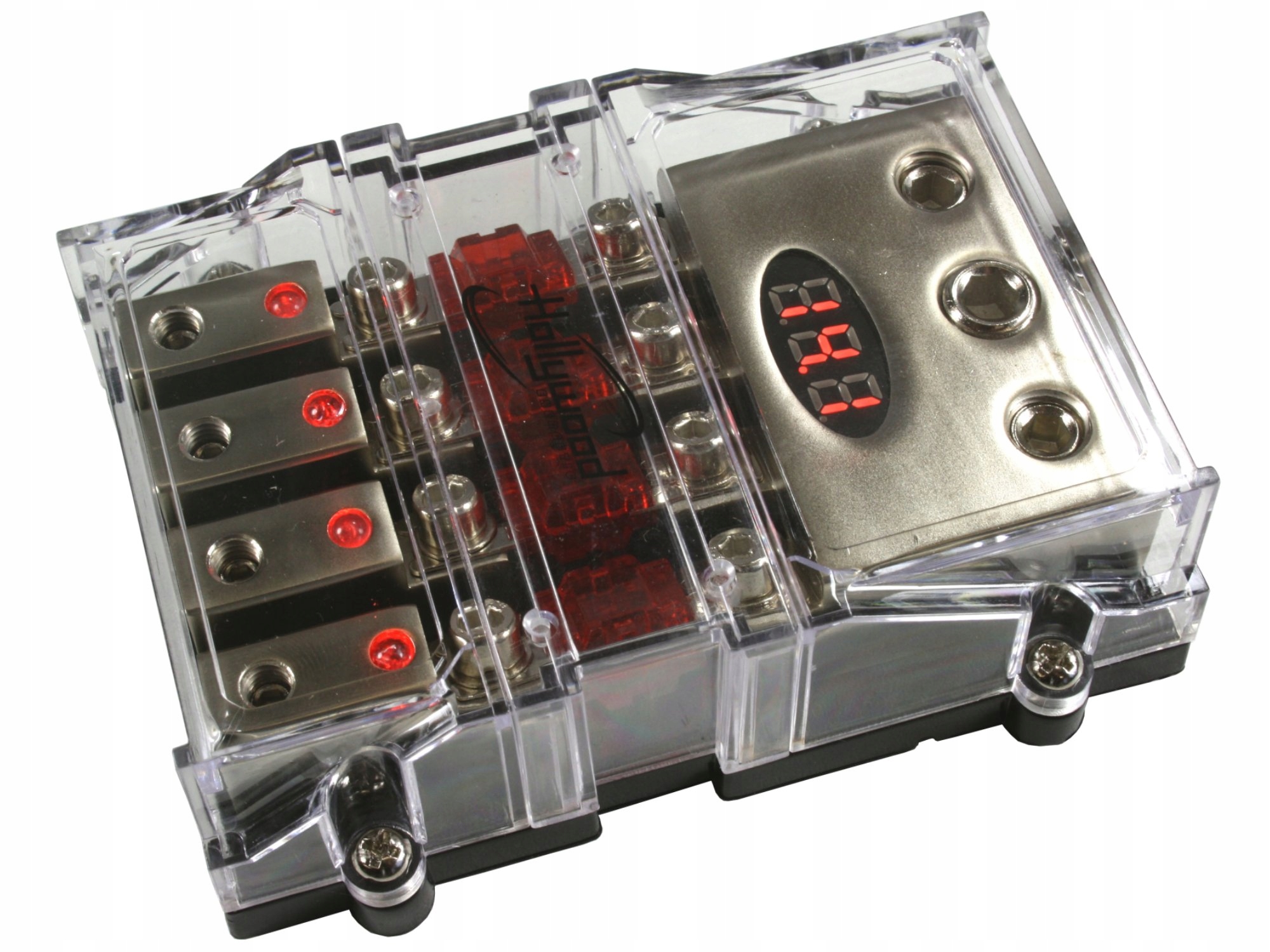 держатель для 4-х предохранителей автозвука типа Mini-ANL - вход 1х53мм2 + 1х21мм2 / выход 4х21мм2, вольтметр, красный дисплей