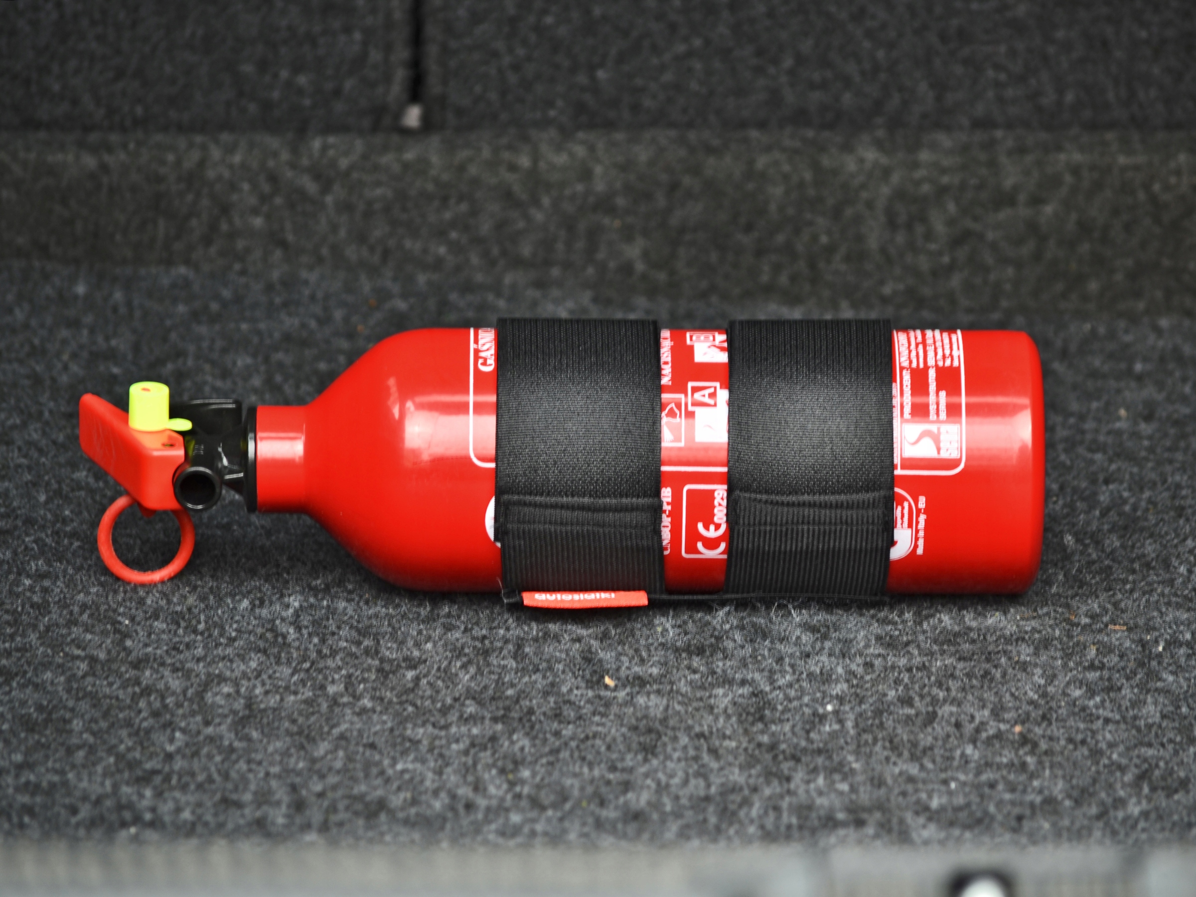 Перед покупкой убедитесь, что липучка прилипает к обивке багажника. Если липучка, например, от куртки или сумки, прилипнет к ковру, лента огнетушителя будет вести себя таким же образом.