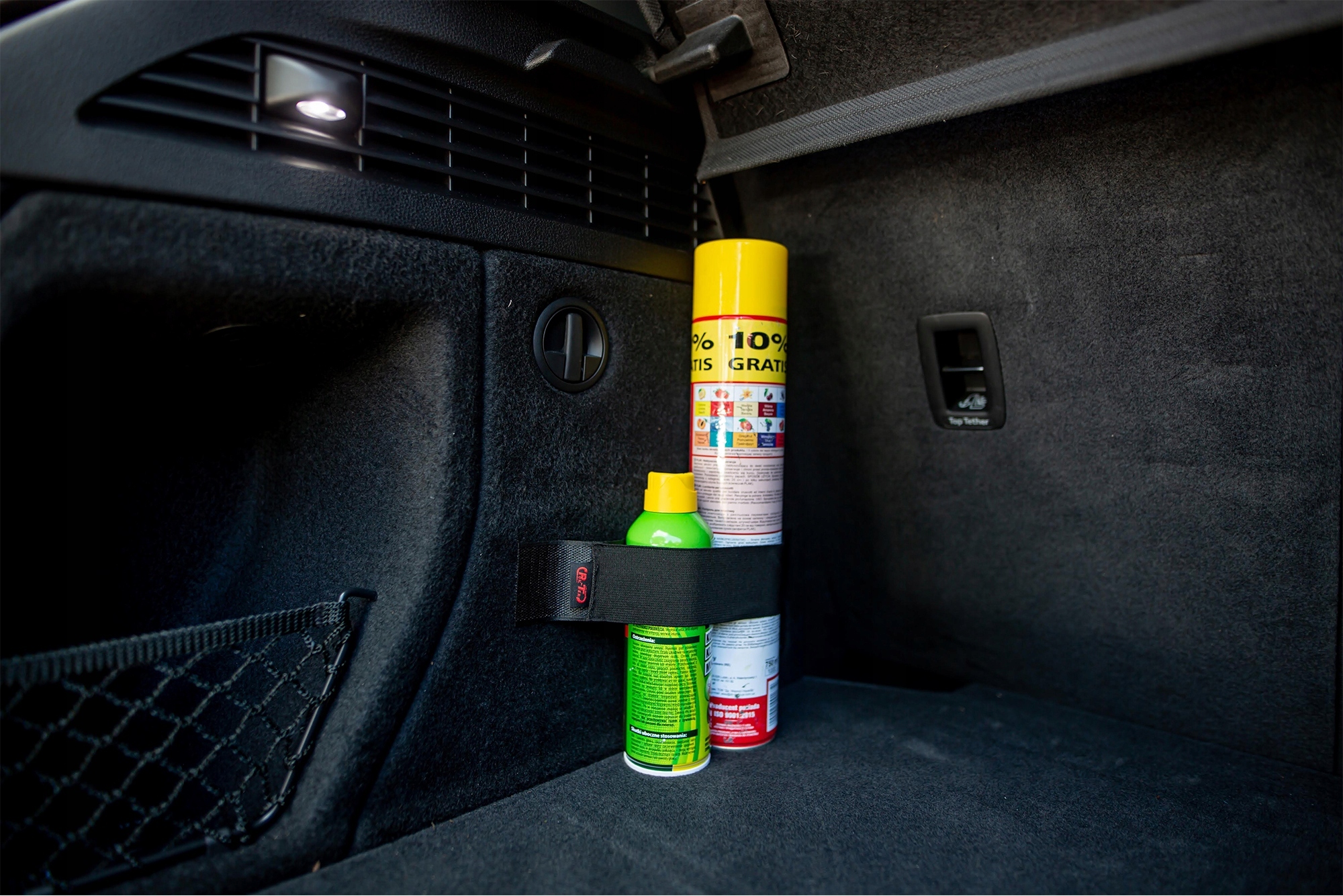 Держатель имеет прочную застежку-липучку, которая идеально прилегает к салону автомобиля, коврик которого восприимчив к застежке-липучке. Эластичный шнурок позволяет держателю идеально подходить к предметам, которые мы хотим разместить, поэтому они надежно прилегают к ленте без возможности выскользнуть.