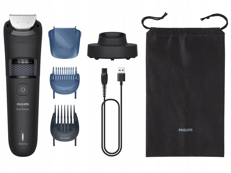 - Аксессуары: 1 насадка-гребень 0,4-10 мм, 1 насадка-гребень 10,4-20 мм, 1 зарядная база, 1 щеточка для чистки лезвий, футляр, USB-кабель.